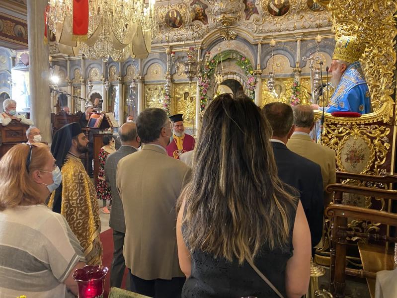 Της Αρχιερατικής Θείας Λειτουργίας προεξήρχε ο Σεβασμιώτατος Μητροπολίτης Σύρου κ. Δωρόθεος Β’, συμπαραστατούμενος από εφημέριους της Σύρου, καθώς επίσης από τον Ηγούμενο της Ιεράς Μονής Παναγίας Τουρλιανής Μυκόνου, Αρχιμ. Αλέξιο Παπαδόπουλο και τον Αρχιερατικό Επίτροπο Μυκόνου π. Πέτρο Μαραγκό οι οποίοι διεκόμισαν τα –φυλασσόμενα στην εν λόγω Μονή- λείψανα των Αγίων και Θεοστέπτων Βασιλέων Κωνσταντίνου κι Ελένης.