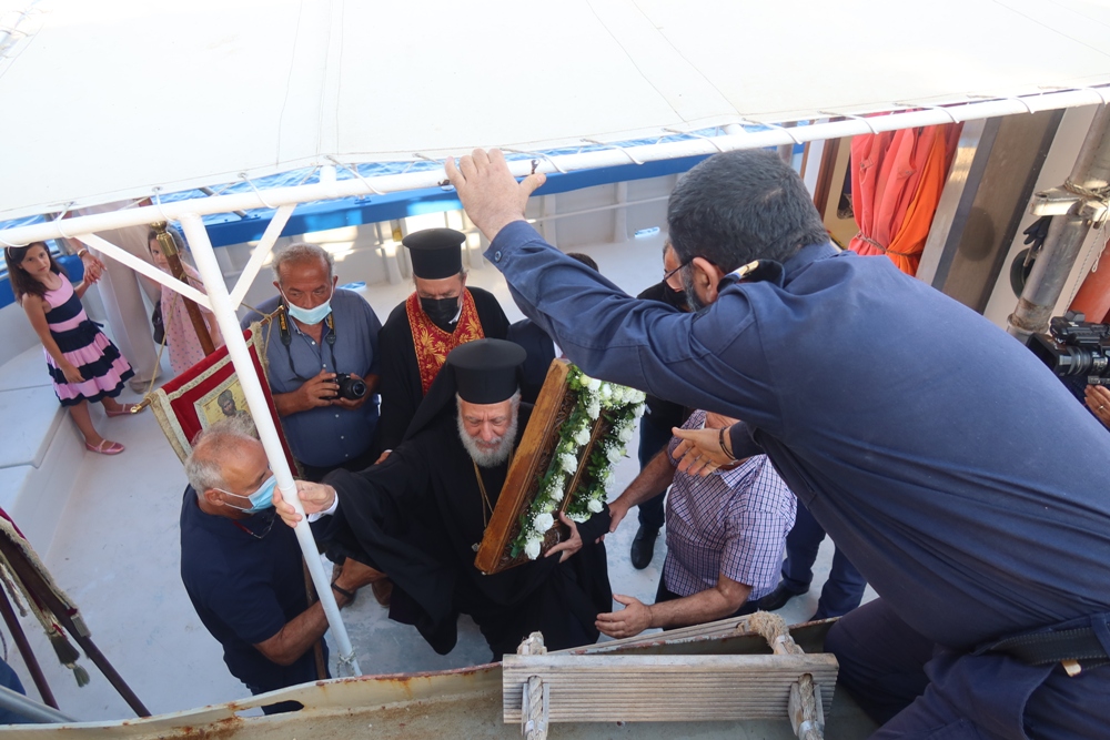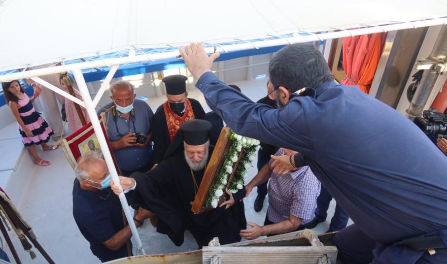 Προηγουμένως, η αγία Εικόνα μεταφέρθηκε με αυτοκινητοπομπή από το σπίτι του Πανηγυρά κ. Αντωνίου Βενιού στον προβλήτα του Πλατύ Γυαλού, όπου επιβιβάσθηκε σε καΐκι, προκειμένου να μεταφερθεί, κατά το έθιμο, στον ιερό βράχο της Χρυσοπηγής.