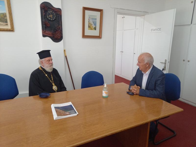 Άμα τη αφίξει του, επεσκέφθη στο Επισκοπείο Θήρας τον Σεβασμιώτατο Γέροντα Μητροπολίτη κ. Επιφάνιο, προς τον οποίο εξέφρασε την τιμή και την αγάπη του Μακαριωτάτου Αρχιεπισκόπου Αθηνών και Πάσης Ελλάδος κ. Ιερωνύμου Β’, των Μελών της Ιεράς Συνόδου και του ευχήθηκε υγεία και μακροημέρευση.