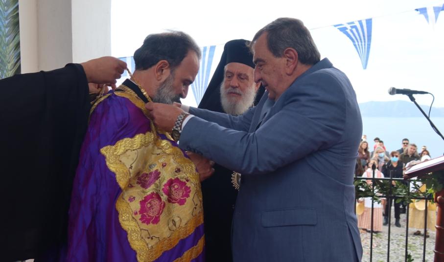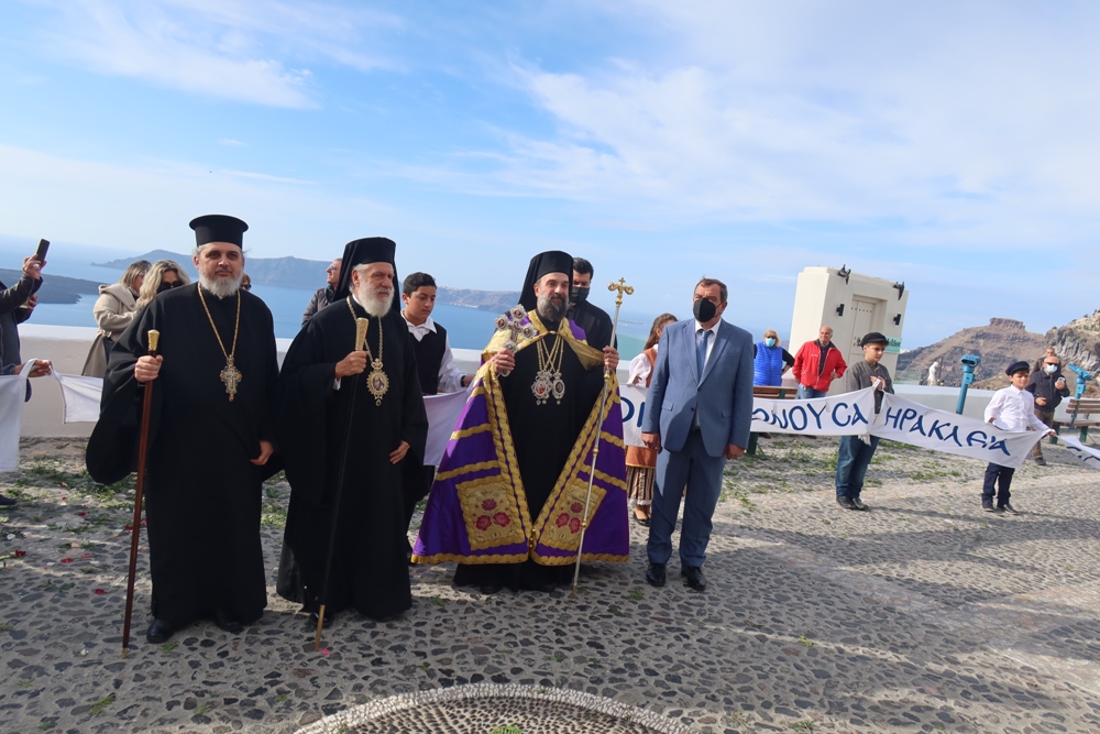 Στα προπύλαια του Ναού υπεδέχθη και προσεφώνησε τον Σεβασμιώτατο κ. Αμφιλόχιο ο Δήμαρχος Σαντορίνης και του προσέφερε Αρχιερατικό Εγκόλπιο.