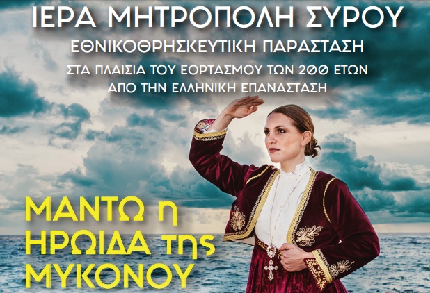 Την Δευτέρα, 6 Δεκεμβρίου και ώρα 7 μ.μ., θα πραγματοποιηθεί στον Ιερό Ναό Αγίου Νικολάου Ερμουπόλεως Εθνικοθρησκευτική Εκδήλωση, με την ευγενική χορηγία Αθανασίου και Μαρίνας Μαρτίνου, αφιερωμένη στην επέτειο των 200 ετών από την Ελληνική Επανάσταση, με την παρουσίαση του θεατρικού δρώμενου, με τίτλο «ΜΑΝΤΩ, Η ΗΡΩΪΔΑ ΤΗΣ ΜΥΚΟΝΟΥ»..