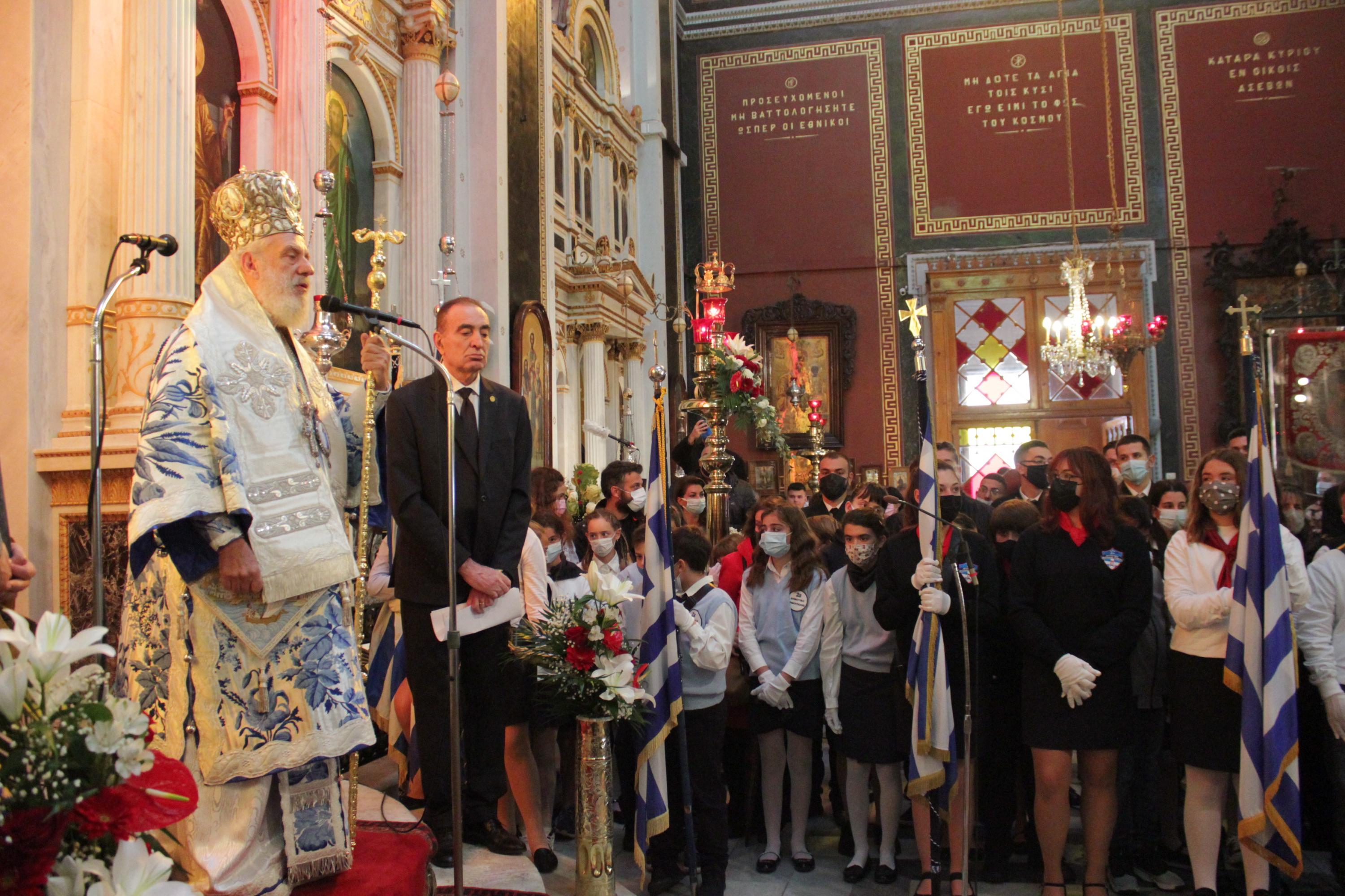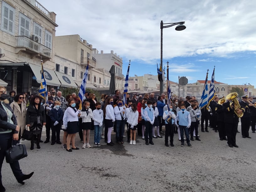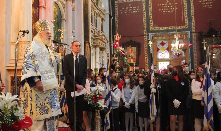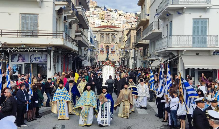 “Η Σύρα υπήρξε η πρώτη πόλη της απελευθερωθείσης Ελλάδος μετά την Επανάσταση του 1821 που δημιουργήθηκε μέσα από τις στάχτες του πολέμου” σημείωσε μεταξύ άλλων ο Μητροπολίτης Σύρου, υπενθυμίζοντας τη δημιουργία της πόλης από τους πρόσφυγες που σώθηκαν από τη σφαγή στη Μικρά Ασία και οι οποίοι “ήρθαν σε αυτόν τον τόπο για να οικοδομήσουν αυτό το θαύμα”.