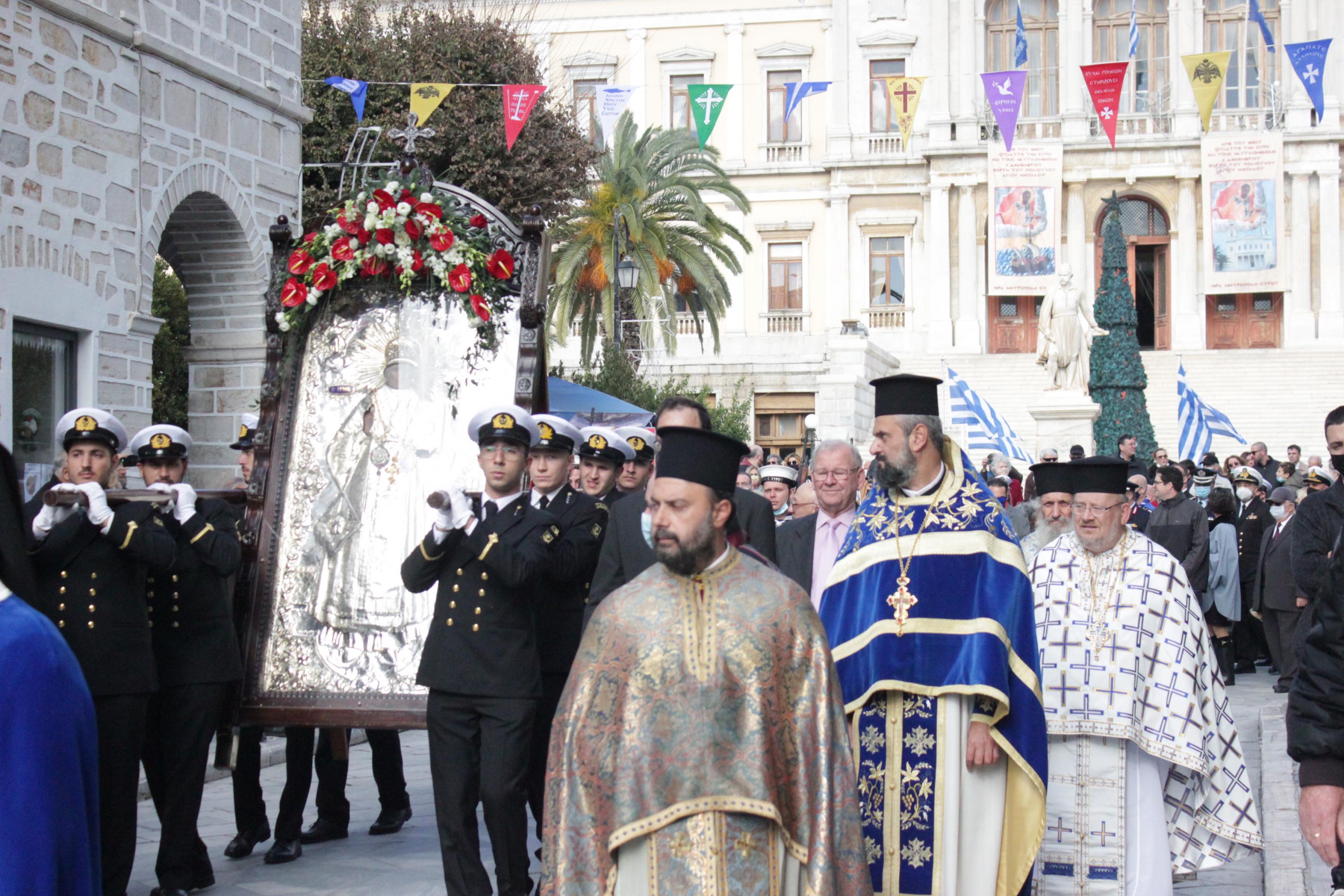 Ιδιαιτέρως συγκινητική υπήρξε η ώρα της λιτανείας της ιερής εικόνας και των τιμίων λειψάνων του Αγίου Νικολάου στους δρόμους της Ερμούπολης, με τη συμμετοχή της Φιλαρμονικής του Λιμενικού Σώματος, για την οποίαν όπως γνωστοποίησε η Ιερά Μητρόπολη Σύρου, μερίμνησε ο πρόεδρος της ONEX, Πάνος Ξενοκώστας, ο οποίος συμμετείχε και στον χθεσινό εορτασμό.