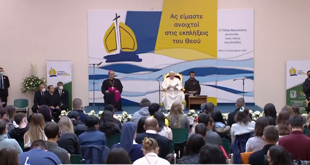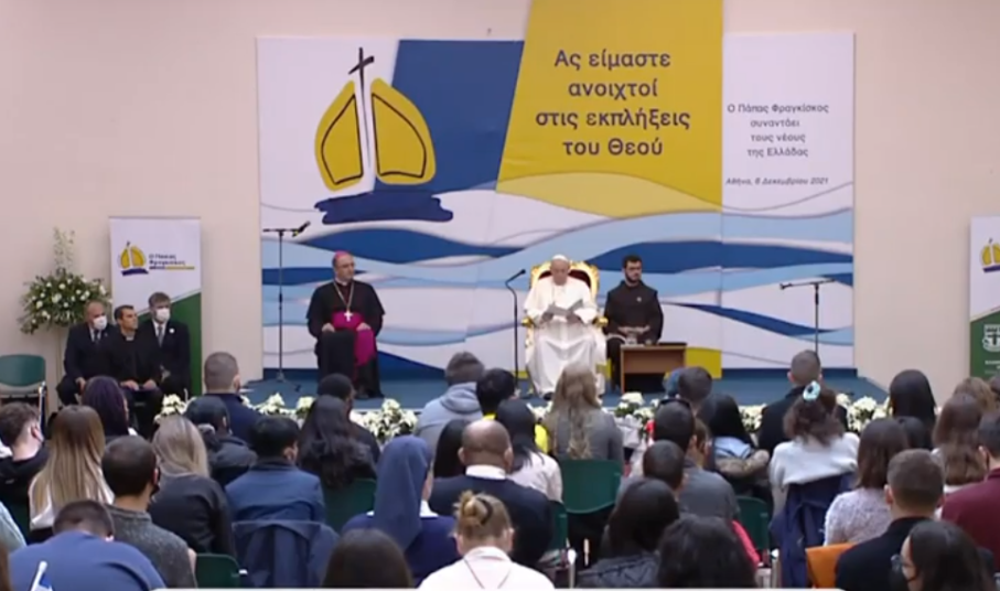 Κατά το χαιρετισμό του, ο π. Πέτρος, μίλησε για την καθολική νεολαία της Ελλάδας, τονίζοντας, πως «αποτελούν ένα μικρό ποίμνιο, διασκορπισμένοι σε μικρές κοινότητες, ενώ κάποιοι ζουν και σπουδάζουν σε πόλεις, όπου δεν υπάρχει καθολική ενοριακή κοινότητα», ενώ μετέφερε τις ευχαριστίες των καθολικών νέων για τη συνάντηση του Πάπα μαζί τους, σημειώνοντας πως ο λόγος του Ποντίφικα, θα βοηθήσει τα παιδιά «να ανακαλύπτουν διαρκώς στην καθημερινότητά τους, την ομορφιά να είναι φίλοι του Χριστού και ζωντανά μέλη της Εκκλησίας Του».