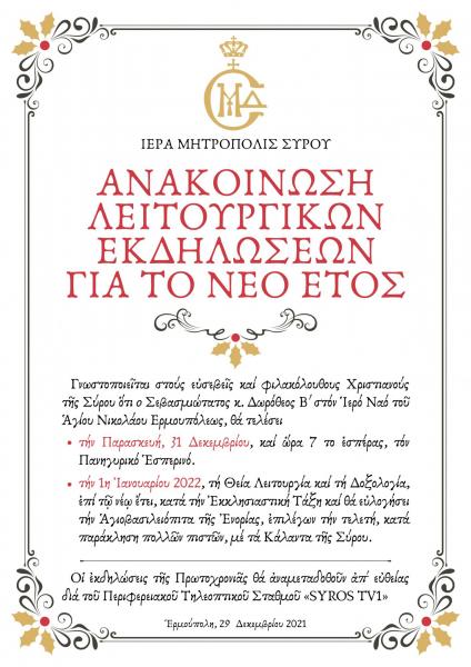 Γνωστοποιεῖται στούς εὐσεβεῖς καί φιλακόλουθους Χριστιανούς τῆς Σύρου ὅτι o Σεβασμιώτατος κ. Δωρόθεος Β΄ στόν Ἱερό Ναό τοῦ Ἁγίου Νικολάου Ερμουπόλεως, θά τελέσει τήν Παρασκευή, 31 Δεκεμβρίου, καί ὥρα 7 το ἑσπέρας, τόν Πανηγυρικό Ἑσπερινό. τήν 1η Ἰανουαρίου 2022, τή Θεία Λειτουργία καί τή Δοξολογία, ἐπί τῷ νέῳ ἔτει, κατά τήν Ἐκκλησιαστική Τάξη καί θά εὐλογήσει τήν Ἁγιοβασιλειόπιτα τῆς Ἐνορίας, ἐπιλέγων τήν τελετή, κατά παράκληση πολλῶν πιστῶν, μέ τά Κάλαντα τῆς Σύρου.
