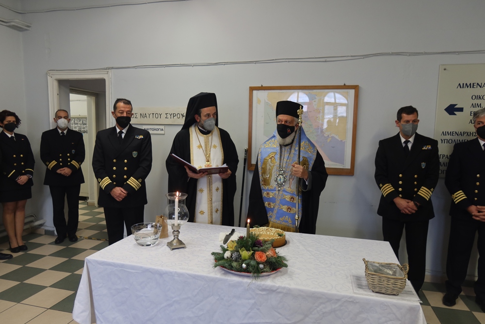 Κατόπιν ευγενικής προσκλήσεως του Λιμενάρχη Σύρου κ. Ιωάννη Βαμβακούση, ο Σεβασμιώτατος κ. Δωρόθεος Β΄ μετέβη σήμερα στο Λιμεναρχείο Σύρου και ευλόγησε την Αγιοβασιλειόπιτα, με την παρουσία του Λιμενάρχη και της Υπολιμενάρχου Σύρου, του Διοικητού της Ακαδημίας Εμπορικού Ναυτικού Σύρου, όλων των υπηρετούντων στο Λιμεναρχείο στελεχών, ανδρών και γυναικών, του Πλοιάρχου του Ε/Γ "ΑΡΤΕΜΙΣ", των δύο πλοηγών και των προσκεκλημένων, της κας Προέδρου και του κ. Εισαγγελέως Εφετών Αιγαίου.
