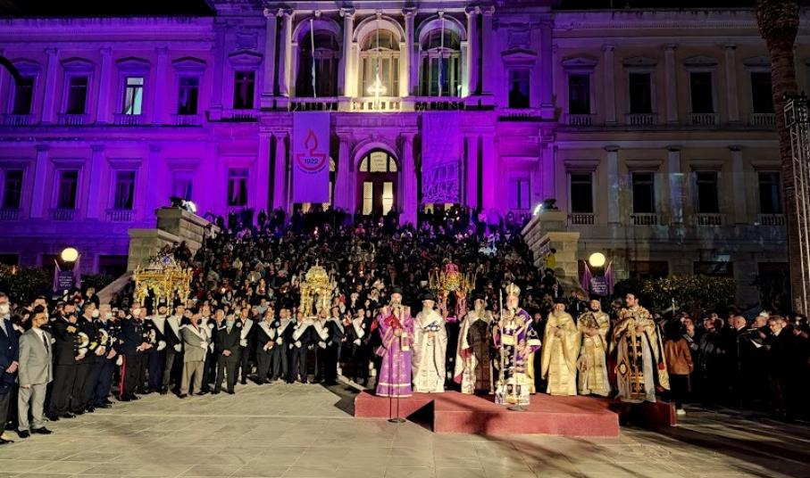 Μετά την προσέλευση και των τριών επιταφίων στην πλατεία Μιαούλη, κατόπιν του ανακρούσματος εμβατηρίων από την Φιλαρμονική του Δήμου και απόδοση ύμνων από την χορωδία του Ι.Ν. Αγίου Νικολάου, ο Σεβασμιώτατος Μητροπολίτης Σύρου, κ. Δωρόθεος Β’, ανέπεμψε δέηση.