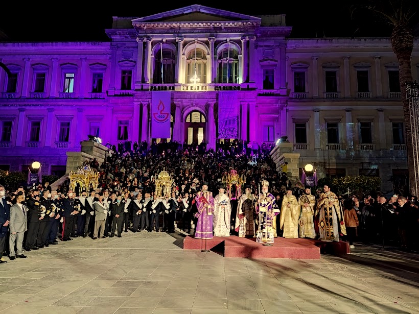 Εκατοντάδες ήταν και οι πιστοί που συγκεντρώθηκαν στο κέντρο της πόλης, προκειμένου να παρακολουθήσουν την Ακολουθία του Επιταφίου στους Ι.Ν. Μεταμορφώσεως του Σωτήρος, Κοιμήσεως της Θεοτόκου και Αγίου Νικολάου και να ακολουθήσουν τη λιτανεία έως την πλατεία Μιαούλη, όπου πραγματοποιήθηκε με κάθε επισημότητα και λαμπρότητα η συνάντηση των τριών επιταφίων, υπό το φωταγωγημένο Δημαρχιακό Μέγαρο της Ερμούπολης.