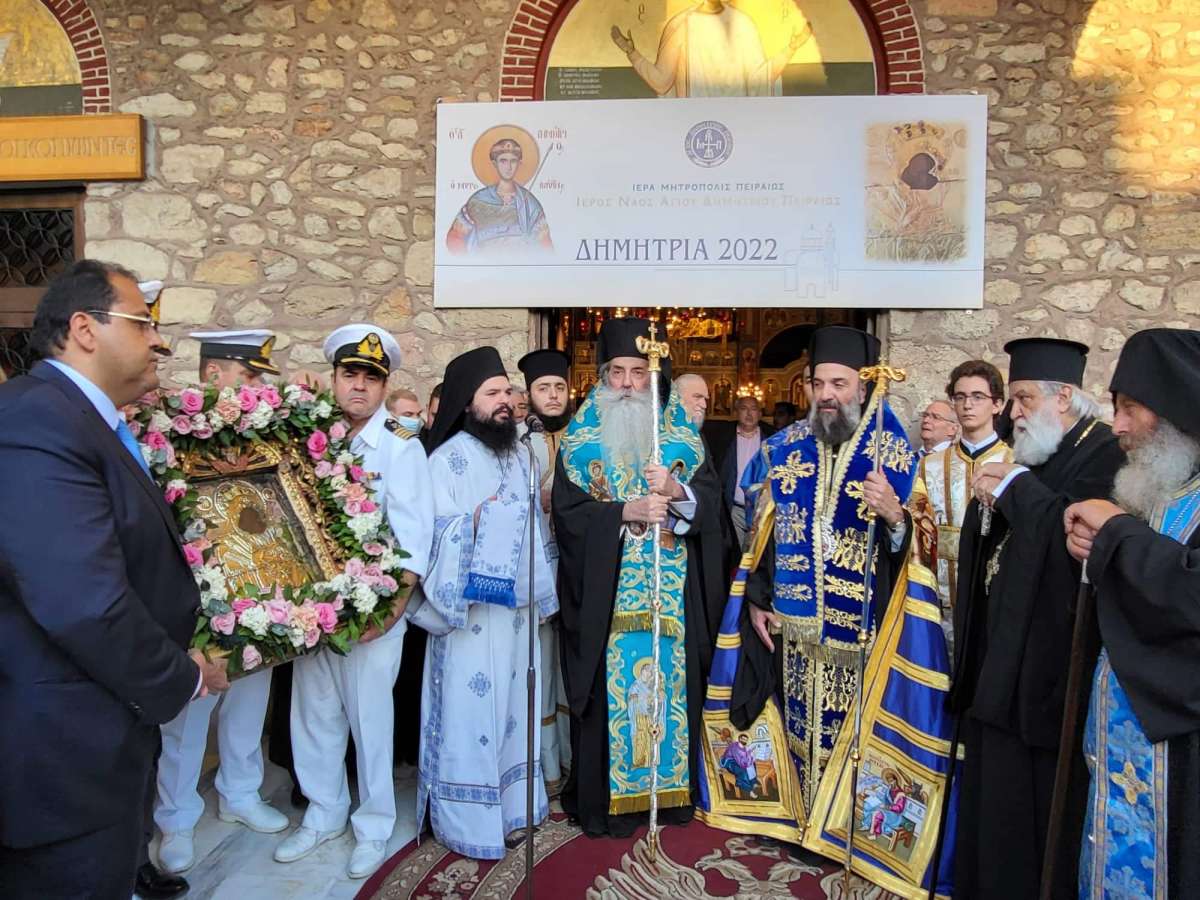 Την υποδέχτηκε, ο Σεβασμιότατος Μητροπολίτης Πειραιώς κ.κ Σεραφείμ, ο Σεβασμιότατος Μητροπολίτης Θήρας Αμοργού και Νήσων κ.κ Αμφιλόχιος και ο Αιδεσιμολογιότατος π.Θωμας Συνοδινός , άγημα του Πολεμικού Ναυτικού, η μπάντα του Λιμενικού Σώματος και πλήθος πιστών.
