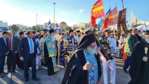 Στη συνέχεια, τελέστηκε δέηση από τον Σεβ.. Μητροπολίτη Θήρας κ. Αμφιλόχιο και ακολούθησε λιτανευτική πομπή προς τον Ιερό Ναό Αγίου Δημητρίου Πειραιώς όπου τελέστηκε δέηση και δοξολογία.