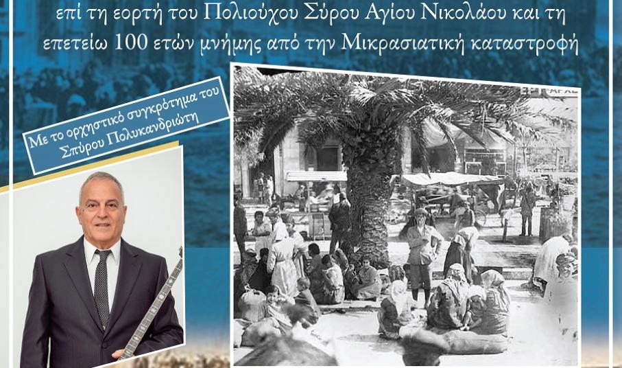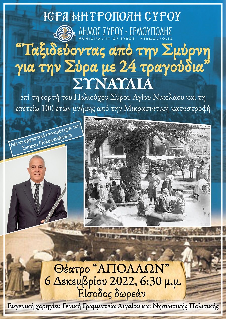 ΤΡΙΤΗ, 6 ΔΕΚΕΜΒΡΙΟΥ 2022 7.30 π.μ. : Όρθρος 8.15 π.μ.: Αρχιερατική Χοροστασία 08.45 π.μ.: Έναρξη της Τρισαρχιερατικής Θείας Λειτουργίας, προεξάρχοντος του Σεβασμιωτάτου Μητροπολίτου Βεροίας κ. Παντελεήμονος και συνιερουργούντων των Σεβασμιωτάτων Μητροπολιτών Κηφισίας κ. Κυρίλλου και Σύρου κ. Δωροθέου Β΄. 10.45: Πάνδημη Λιτανεία της ιεράς Εικόνος και του αποτμήματος εκ των τιμίων Λειψάνων του Αγίου Νικολάου, κατά τα ειωθότα, επικεφαλής έχουσα τη Φιλαρμονική του Δήμου Σύρου - Ερμούπολης, με τη συμμετοχή Μελών του Λυκείου Ελληνίδων Σύρου, Σπουδαστών τῆς Ναυτικής Ακαδημίας, Μαθητών, Προσκόπων και Αγήματος του Πολεμικού Ναυτικού, η οποία θα ακολουθήσει την πορεία: Άγιος Νικόλαος - Θέατρο Απόλλων - Πλατεία Μιαούλη, όπου θα αναπεμφθεί δέηση υπέρ των ναυτιλλομένων - οδός Ερμού - Ακτή Πέτρου Ράλλη - Πλατεία Κανάρη, όπου θα ριφθούν στέφανα στη θάλασσα στη μνήμη των πνιγέντων ναυτικών από τον Σεβασμιώτατο κ. Δωρόθεο Β΄, τον Εκπρόσωπο της Κυβερνήσεως και τον Πρόεδρο των Απομάχων Ναυτικών, ενώ πλοία του Πολεμικού Ναυτικού, του Λιμενικού Σώματος, των Αλιέων, του Ναυτικού Ομίλου Σύρου και ιδιωτών θα αποδίδουν τιμές. Επιστροφή στον Ιερό Ναό, διά της οδού Θυμάτων Σπερχειού.