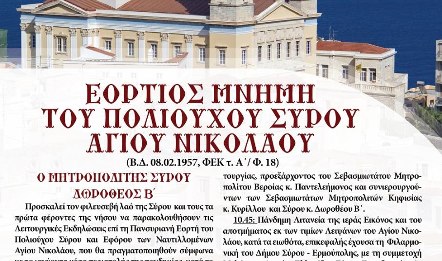 O Μητροπολίτης Σύρου προσκαλεί τον φιλευσεβή λαό της Σύρου και τους τα πρώτα φέροντες της νήσου να παρακολουθήσουν τις Λειτουργικές Εκδηλώσεις επί τη Πανσυριανή Εορτή του Πολιούχου Σύρου και Εφόρου των Ναυτιλλομένων Αγίου Νικολάου, που θα πραγματοποιηθούν σὐμφωνα με τα ισχύοντα μέσα περιστολής της πανδημίας, κατά το εξἠς Πρόγραμμα: