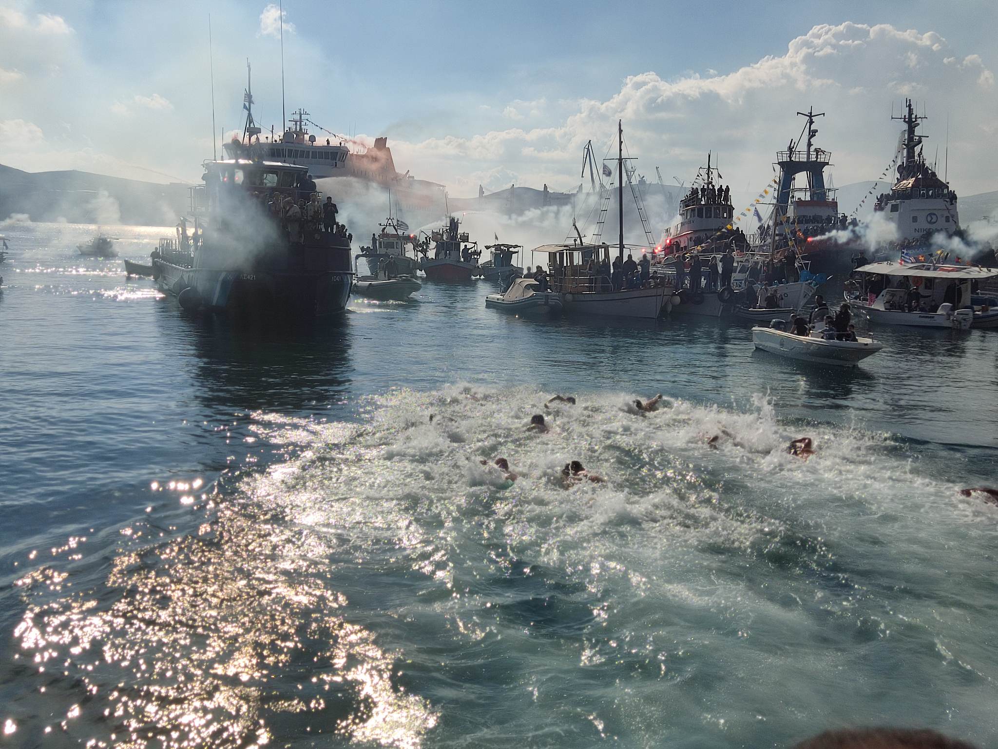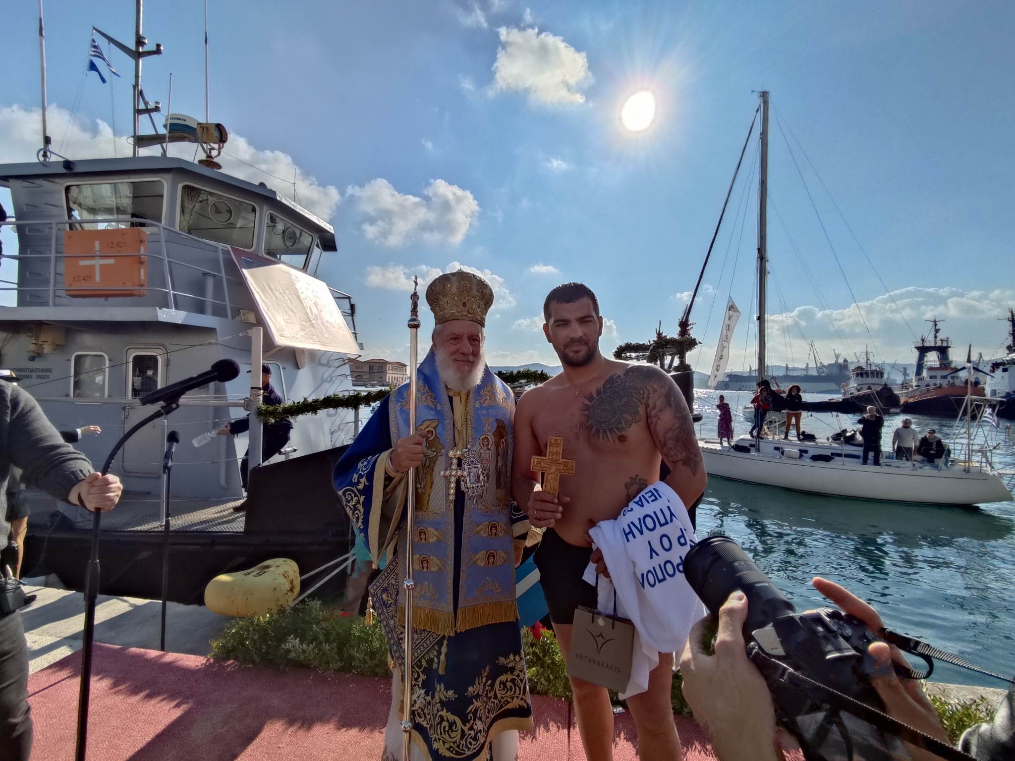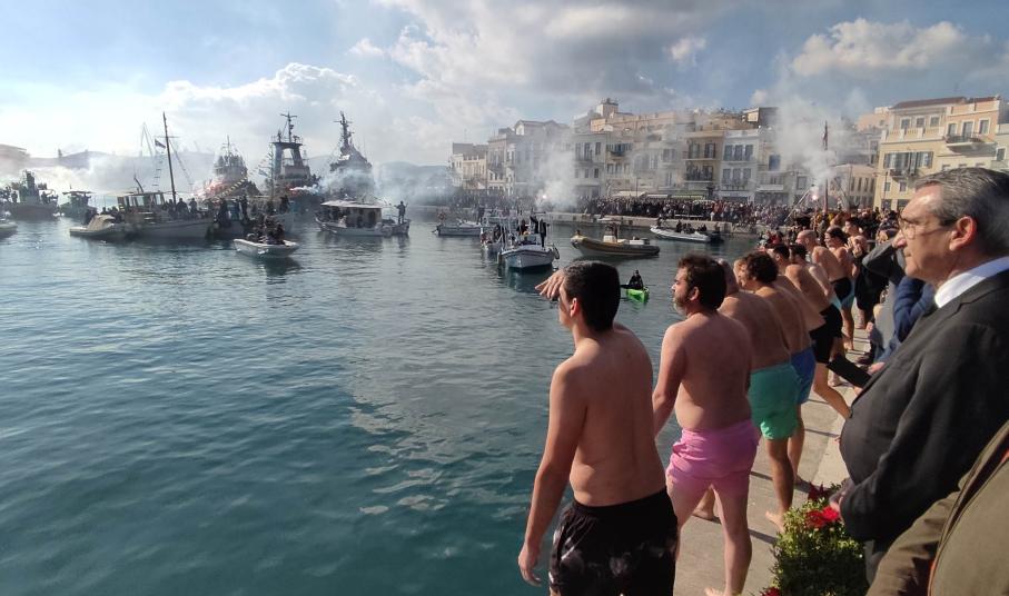 Οι πιστοί παρακολούθησαν την τελετή του αγιασμού των υδάτων έχοντας κατακλύσει όλο το λιμάνι, ενώ ο μητροπολίτης Σύρου επιβιβάστηκε σε σκάφος του Λιμενικού Σώματος για να προχωρήσει στη ρίψη του Τιμίου Σταυρού στη θάλασσα.