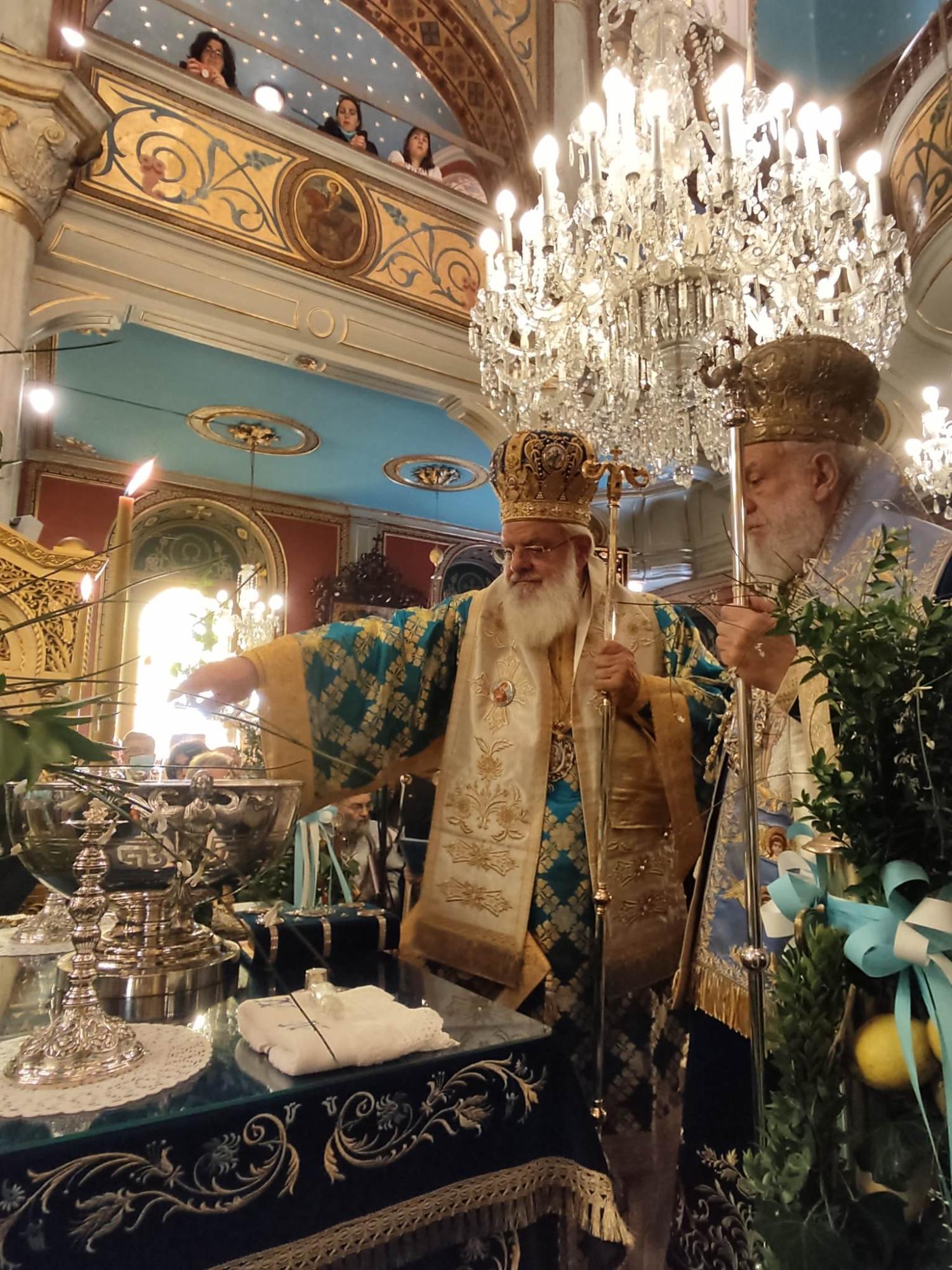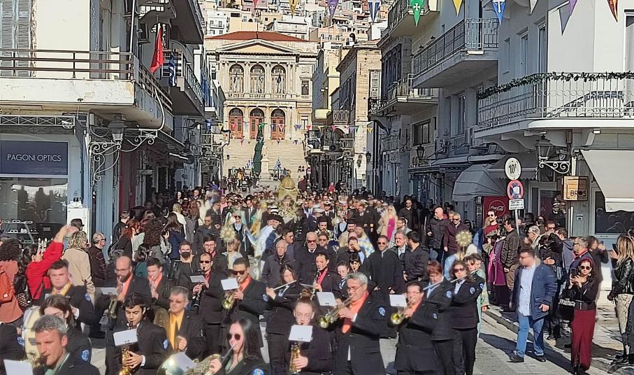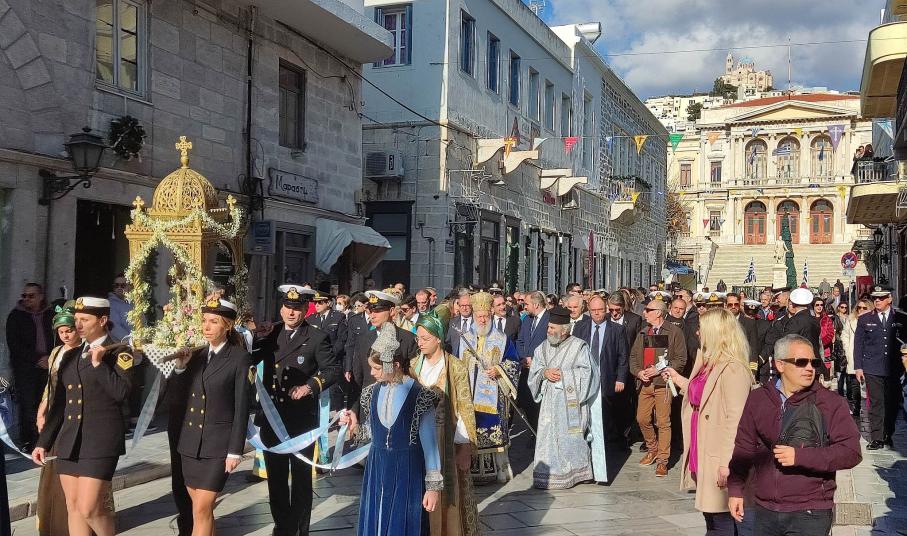 Προηγουμένως, ο μητροπολίτης Σύρου, πλαισιωμένος από τον μητροπολίτη Βρεσθένης, Θεόκλητο τέλεσε τη Θεία Λειτουργία και τον Μέγα Αγιασμό στον μητροπολιτικό ναό Μεταμορφώσεως του Σωτήρος, παρουσία εκπροσώπων όλων των Αρχών του τόπου. Καθ΄ όλη τη διάρκεια της πομπής η Φιλαρμονική Σύρου παιάνιζε ύμνους, ενώ συμμετοχή είχαν και οι Πρόσκοποι Σύρου, όπως και το Λύκειο Ελληνίδων. Το ηλιόλουστο πρωινό αποτέλεσε έναν ισχυρό “σύμμαχο” ώστε ο κόσμος να παρευρεθεί στο λιμάνι της Ερμούπολης και να παρακολουθήσει τη σημαντική χριστιανική γιορτή.