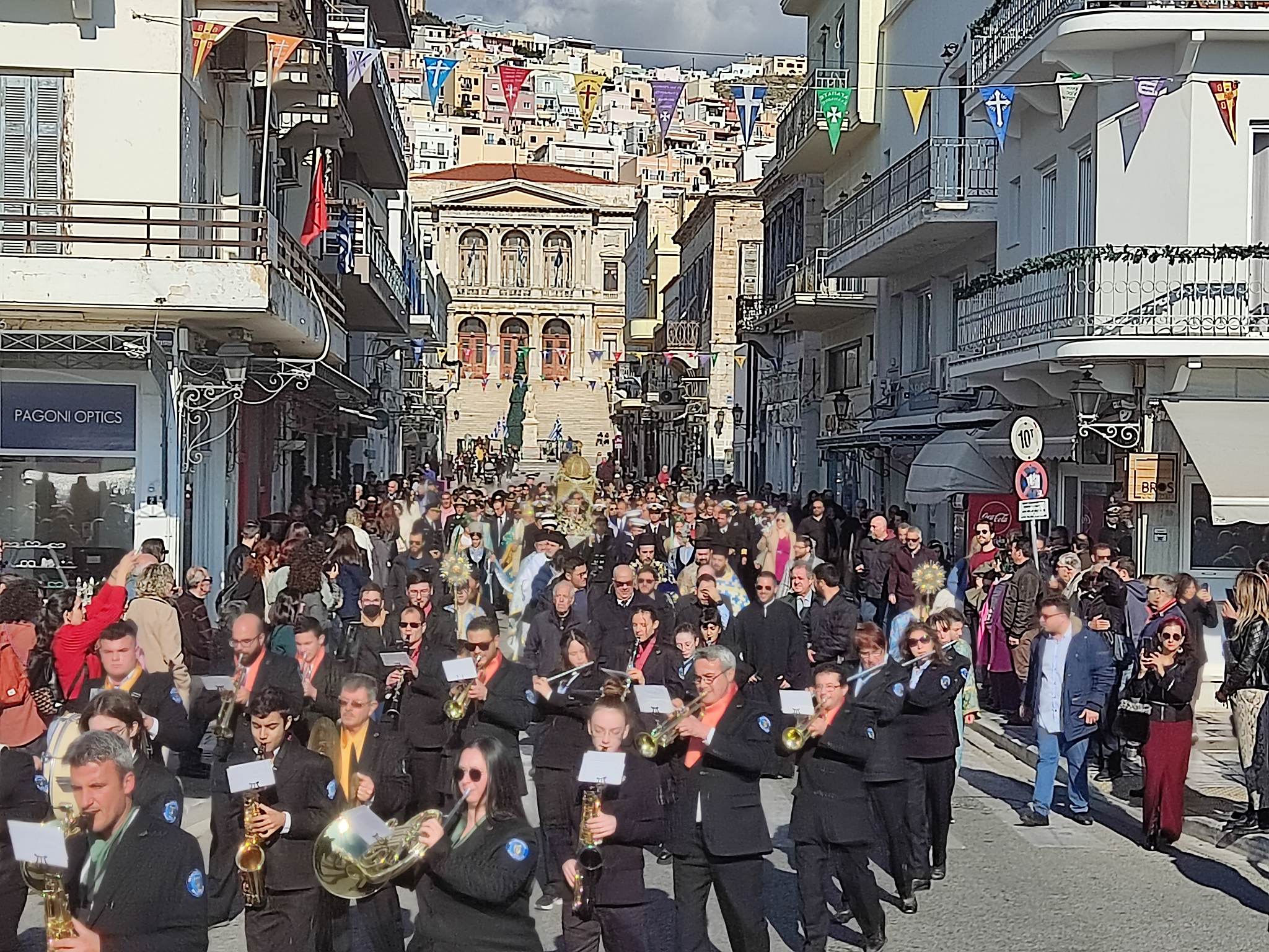 Όμορφες εικόνες “κόσμησαν” το ηλιόλουστο ιστορικό κέντρο της Ερμούπολης, το πρωί της Παρασκευής, καθώς η λιτανευτική πομπή διήλθε από τους μικρούς και μεγάλους δρόμους της πόλης, μέχρι να καταλήξει στο σημείο του μνημείου της Εθνικής Αντιστάσεως.