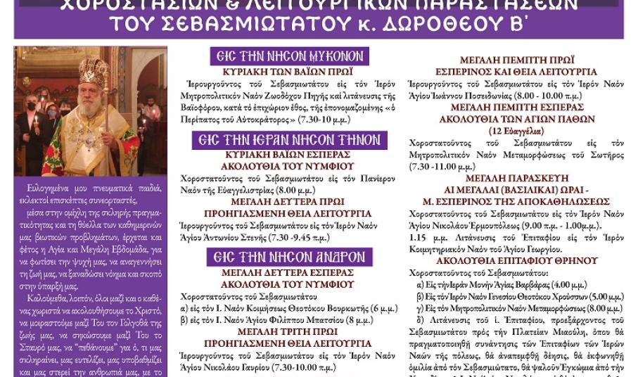 Ανακοίνωση για το πρόγραμμα των Ακολουθιών της Μεγάλης Εβδομάδας, εξέδωσε η Ιερά Μητρόπολη Σύρου, η οποία ξεκινά με ένα μήνυμα του Μητροπολίτη Δωρόθεου: