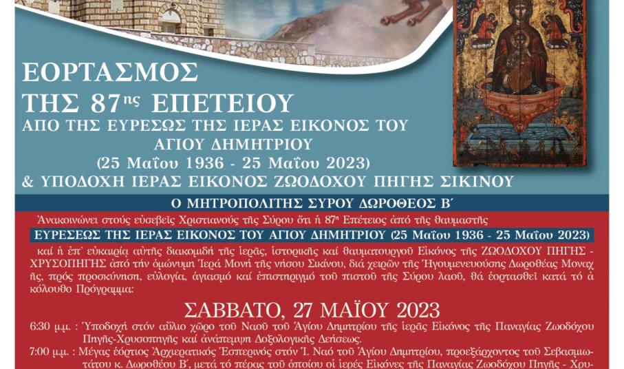 Σύρος: Πρόγραμμα εορτασμού ευρέσεως της ιερής εικόνας του Αγίου Δημητρίου Τετάρτη 24 Μαΐου 2023 - 14:51 Διαφήμιση Το πρόγραμμα του εορτασμού της ευρέσεως της ιερής εικόνας του Αγίου Δημητρίου ανακοίνωσε η Ιερά Μητρόπολη Σύρου. Διαφήμιση #Κοινωνία #Εκκλησιαστικά #εορτασμός Αγίου Δημητρίου