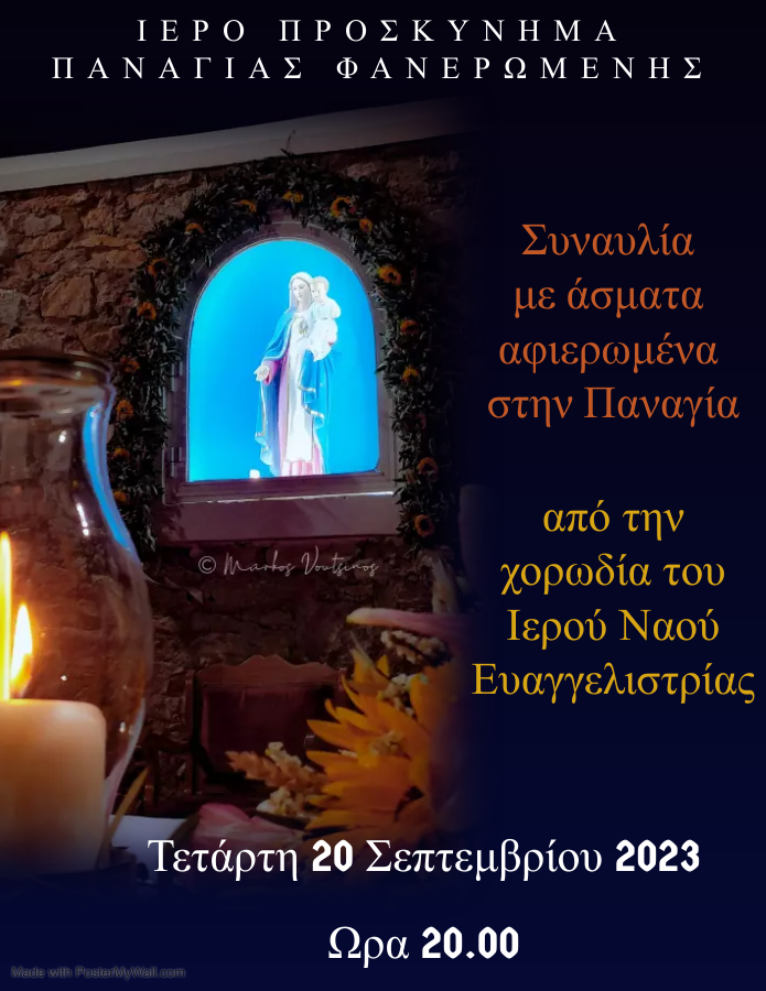 Στα πλαίσια του οκταημέρου εορτασμού της Παναγίας της Φανερωμένης, η μικτή χορωδία του Ιερού Ναού της Ευαγγελιστρίας, θα πραγματοποιήσει συναυλία με άσματα αφιερωμένα στην Παναγία, την Τετάρτη 20 Σεπτεμβρίου και ώρα 8.00 μ.μ. στον Ιερό Προσκυνηματικό Ναό της Παναγίας Φανερωμένης στα Χρούσσα.