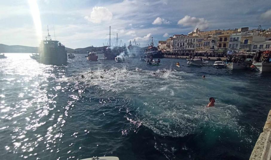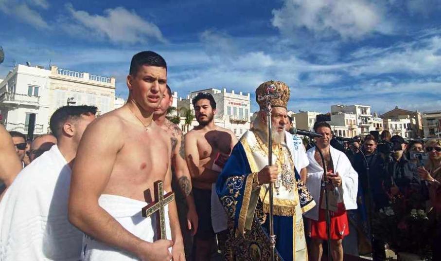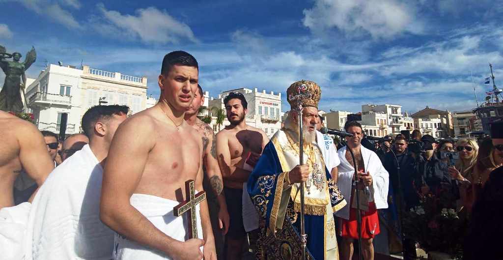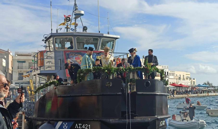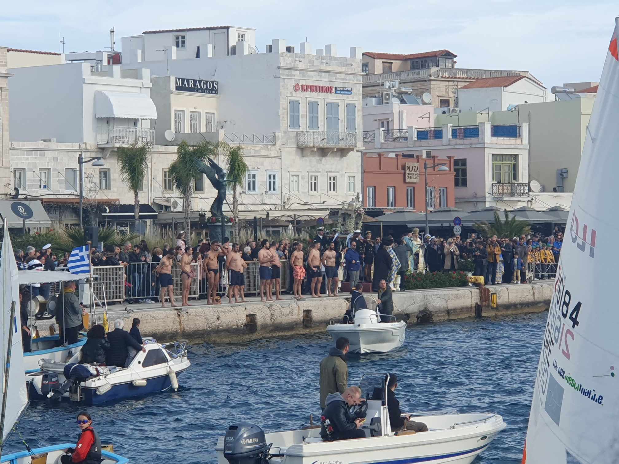 Κάτω από τον ηλιόλουστο ουρανό της πρωτεύουσας των Κυκλάδων και με τη συμμετοχή πλήθους πιστών, τελέστηκε σήμερα Σάββατο ο εορτασμός των Θεοφανείων στη Σύρο, αλλά και ο αγιασμός των υδάτων στο λιμάνι της Ερμούπολης, μπροστά από το μνημείο της Εθνικής Αντίστασης.