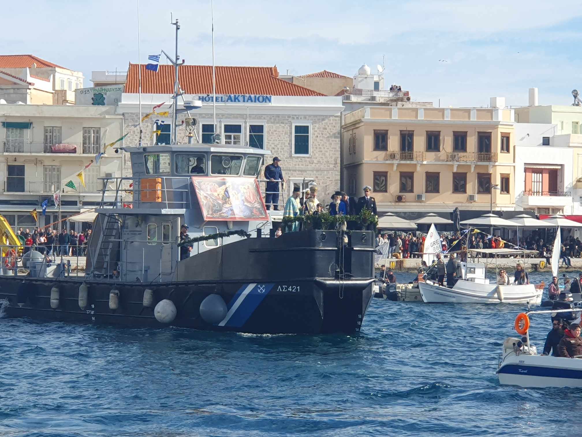 Οι εορταστικές εκδηλώσεις άρχισαν με τη θεία λειτουργία που πραγματοποιήθηκε το πρωί στον μητροπολιτικό ναό της Μεταμορφώσεως, ενώ στη συνέχεια ακολούθησε λιτανεία με επικεφαλής τον μητροπολίτη Σύρου, Δωρόθεο Β’, αλλά και με την παρουσία ανδρών του Λιμενικού Σώματος, της Φιλαρμονικής του Δήμου Σύρου - Ερμούπολης, του Λυκείου Ελληνίδων Σύρου και του Σώματος Ελλήνων Προσκόπων, η οποία κατέληξε στο λιμάνι.