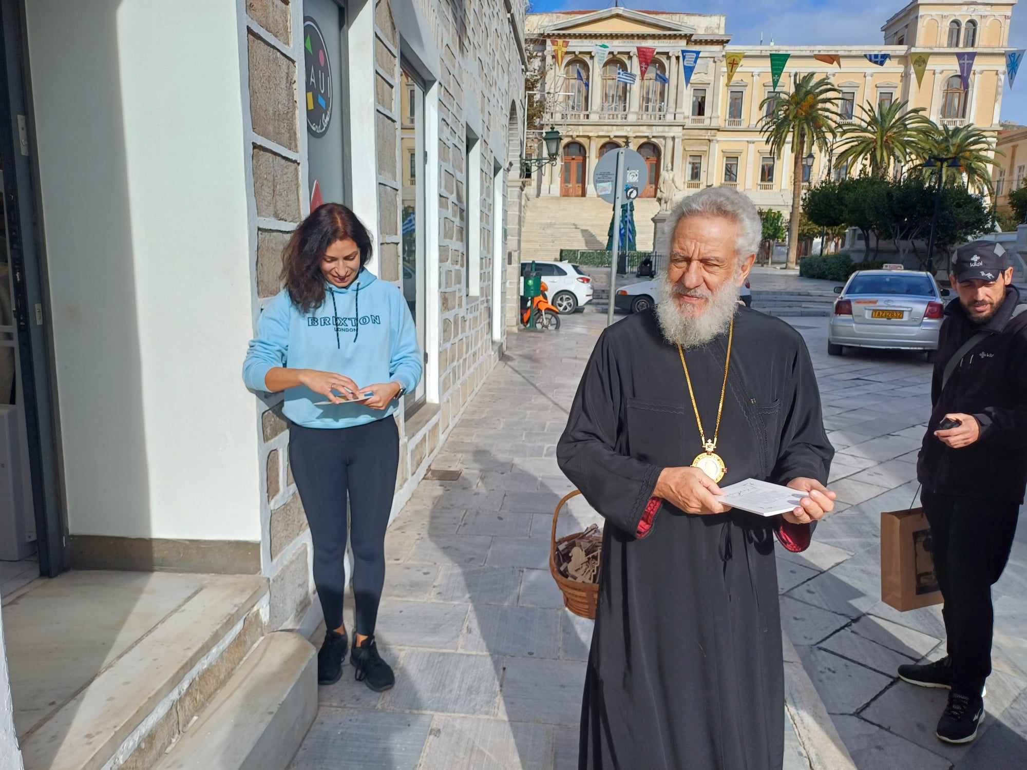 Μάλιστα, η εικόνα του μητροπολίτη Σύρου να κάνει βόλτα στα μαγαζιά της Ερμούπολης σκόρπισε ενθουσιασμό στους περαστικούς, καθώς δεν ήταν λίγοι αυτοί που τον σταμάτησαν, προκειμένου να ζητήσουν τις ευχές και την ευλογία του.