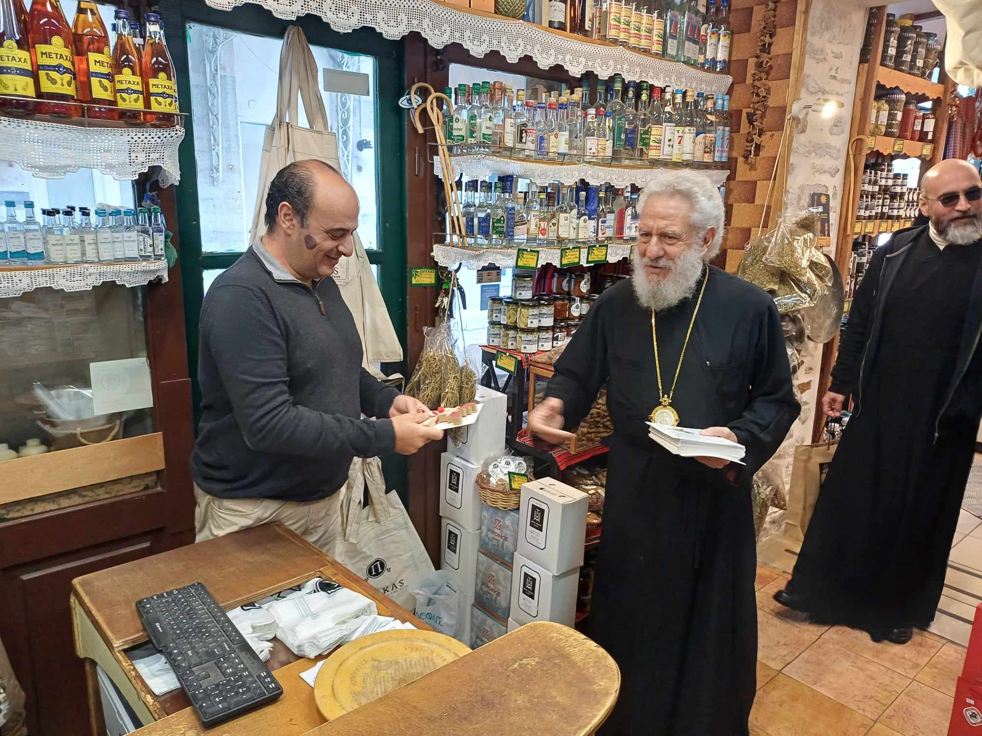 Κατά τη διάρκεια της περιήγησης του στις εμπορικές επιχειρήσεις του ιστορικού κέντρου της Ερμούπολης, ο μητροπολίτης Σύρου είχε την ευκαιρία να ανταλλάξει απόψεις σχετικά με την αγοραστική κίνηση των ημερών.