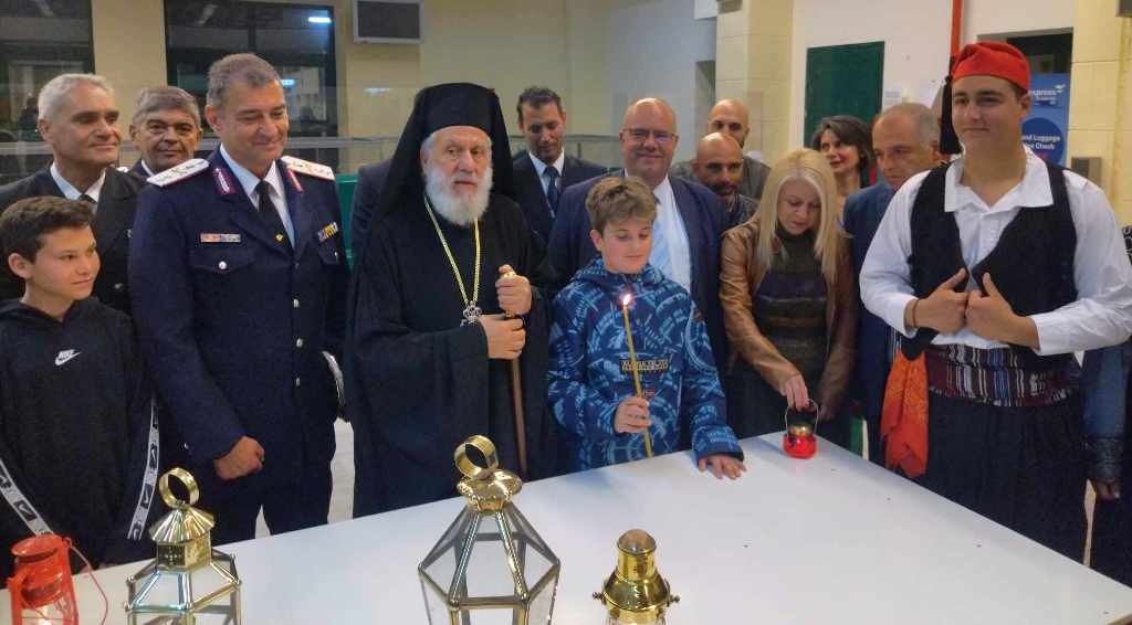 Το Άγιο Φως υποδέχτηκε ο μητροπολίτης Σύρου Δωρόθεος Β’, λίγο μετά τις 9 το βράδυ του Μεγάλου Σαββάτου στο αεροδρόμιο “Δημήτριος Βικέλας”.