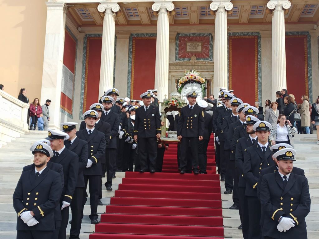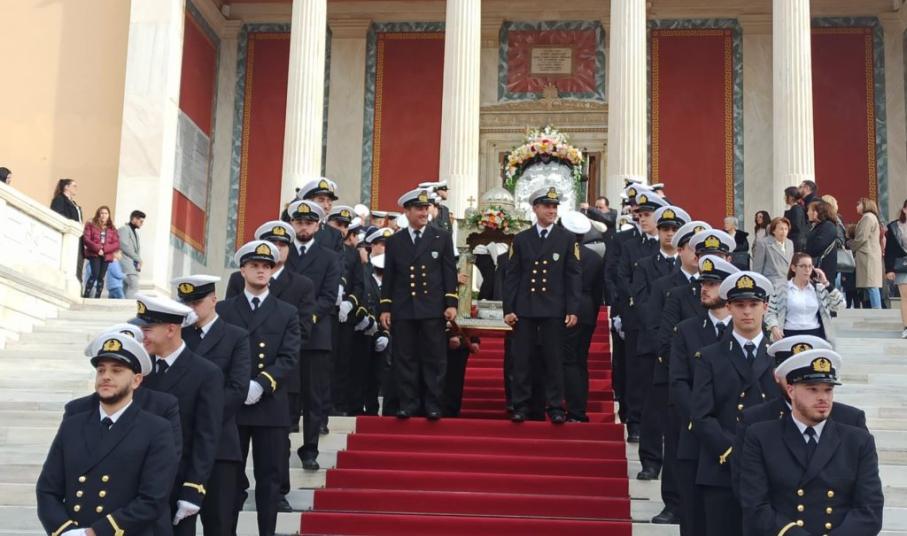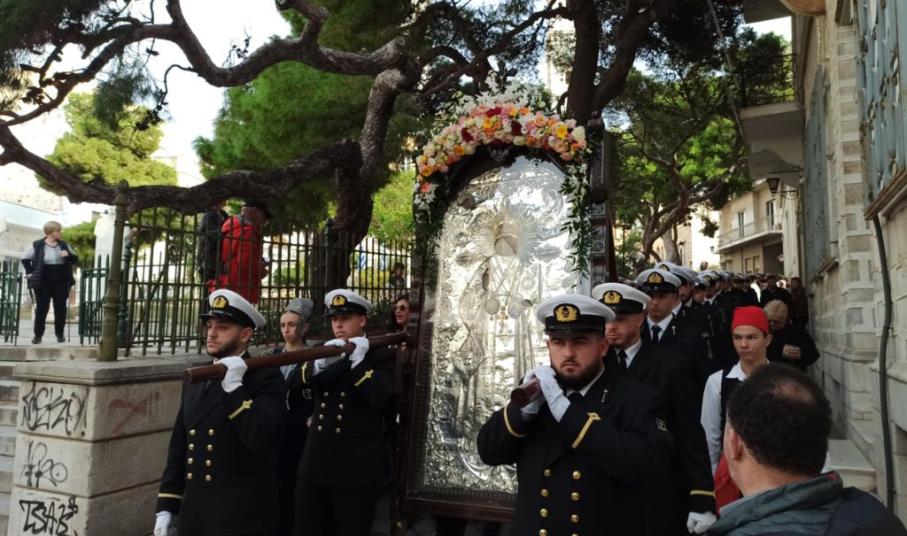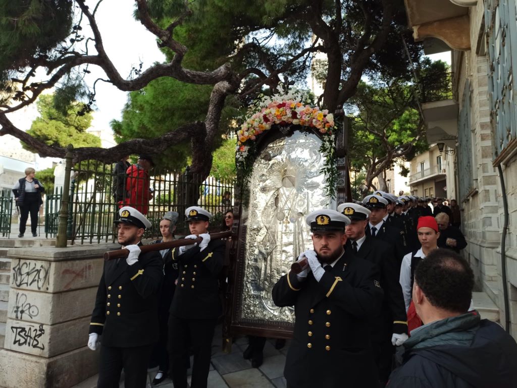 Στη συνέχεια πραγματοποιήθηκε πάνδημη λιτανεία της ιεράς εικόνας, κατά την οποία αναπέμφθηκαν δεήσεις στην πλατεία Μιαούλη υπέρ των ναυτιλλομένων και των εργαζομένων στη θάλασσα και στις ναυπηγικές εγκαταστάσεις, ενώ στη συνέχεια ακολούθησε επί της πλατείας Κανάρη δέηση υπέρ αναπαύσεως των ψυχών των εν θαλάσση πνιγέντων και ναυάγιω τελειωθέντων πατέρων και αδελφών, καθώς και ρίψη στεφάνων στη μνήμη των ναυτικών που χάθηκαν ταξιδεύοντας στα πελάγη και τους ωκεανούς της οικουμένης.