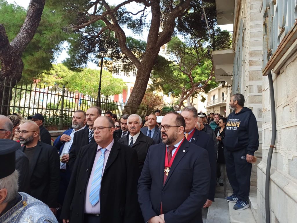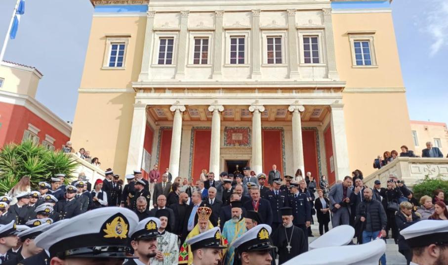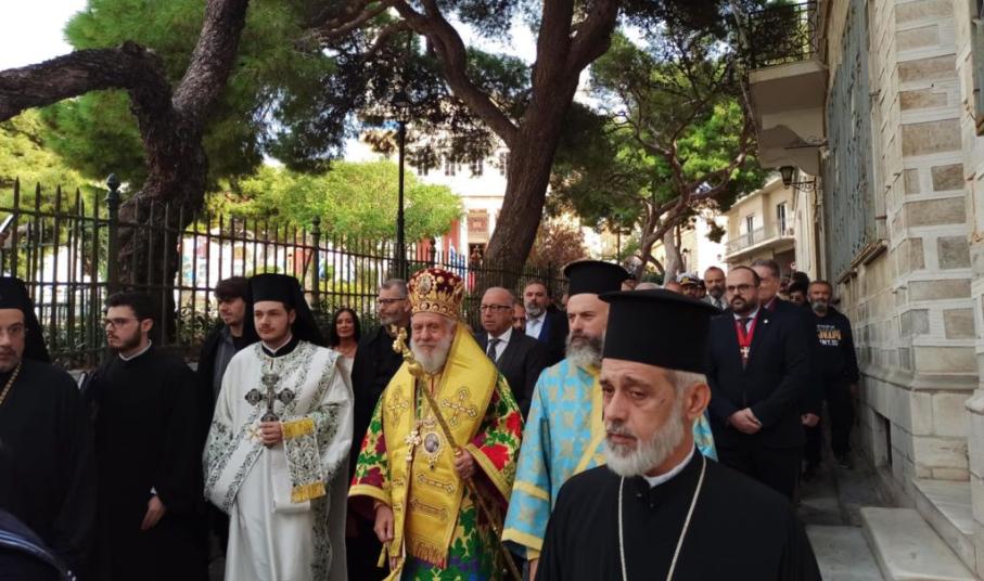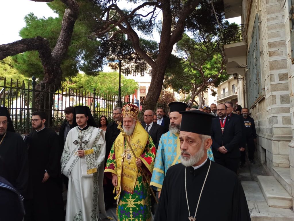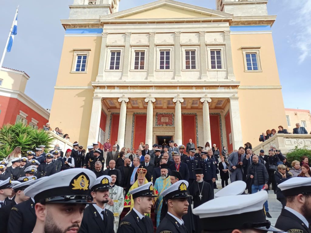 Στο πλαίσιο του εορτασμού τελέστηκε η Τρισαρχιερατική Θεία Λειτουργία, προεξάρχοντος του μητροπολίτου Σύρου, κ.κ. Δωροθέου Β', παρουσία του γ.γ Νησιωτικής Πολιτικής, Μανώλη Κουτουλάκη, εκπροσώπου της καθολικής εκκλησίας, του αντιπεριφερειάρχη Κυκλάδων, Γιώργου Λεονταρίτη, του δημάρχου Σύρου-Ερμούπολης, Αλέξης Αθανασίου, εκπρόσωπων των τοπικών αρχών, των στρατιωτικών αρχών, των σωμάτων ασφαλείας και πλήθους πιστών.
