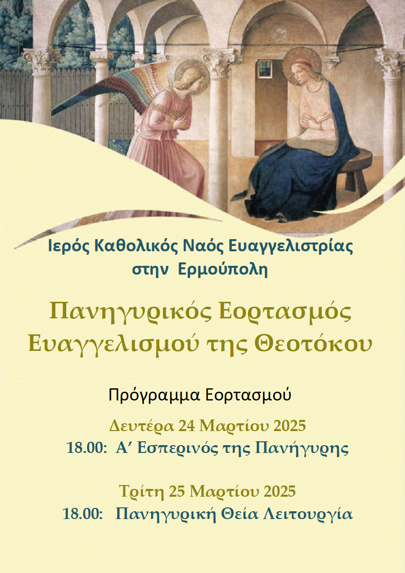 Από την Καθολική Επισκοπή Σύρου ανακοινώνεται προς το χριστεπώνυμο πλήρωμα της Σύρου ότι ο Πανηγυρικός Εορτασμός του Ευαγγελισμού της Θεοτόκου στον Ιερό Καθολικό Ναό Ευαγγελιστρίας στην Ερμούπολη, θα τελεστεί κατά το ακόλουθο πρόγραμμα: