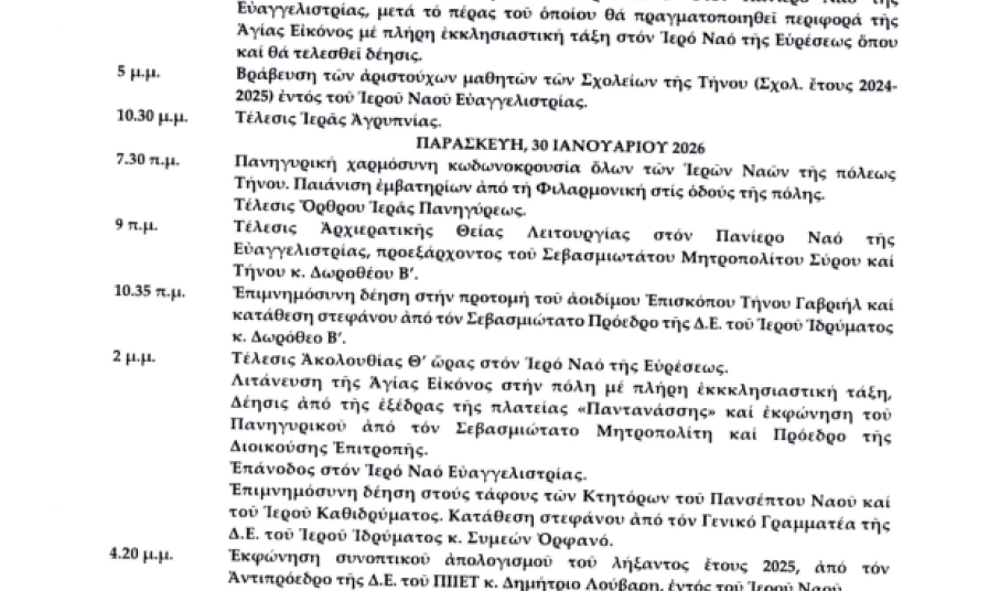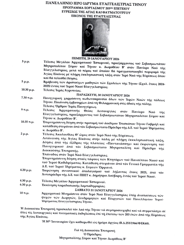 Το αναλυτικό πρόγραμμα για τη 203η Επέτειο της Ευρέσεως της Αγίας & Θαυματουργού Εικόνος της Ευαγγελίστριας, ανακοίνωσε ο Δήμος Τήνου.
