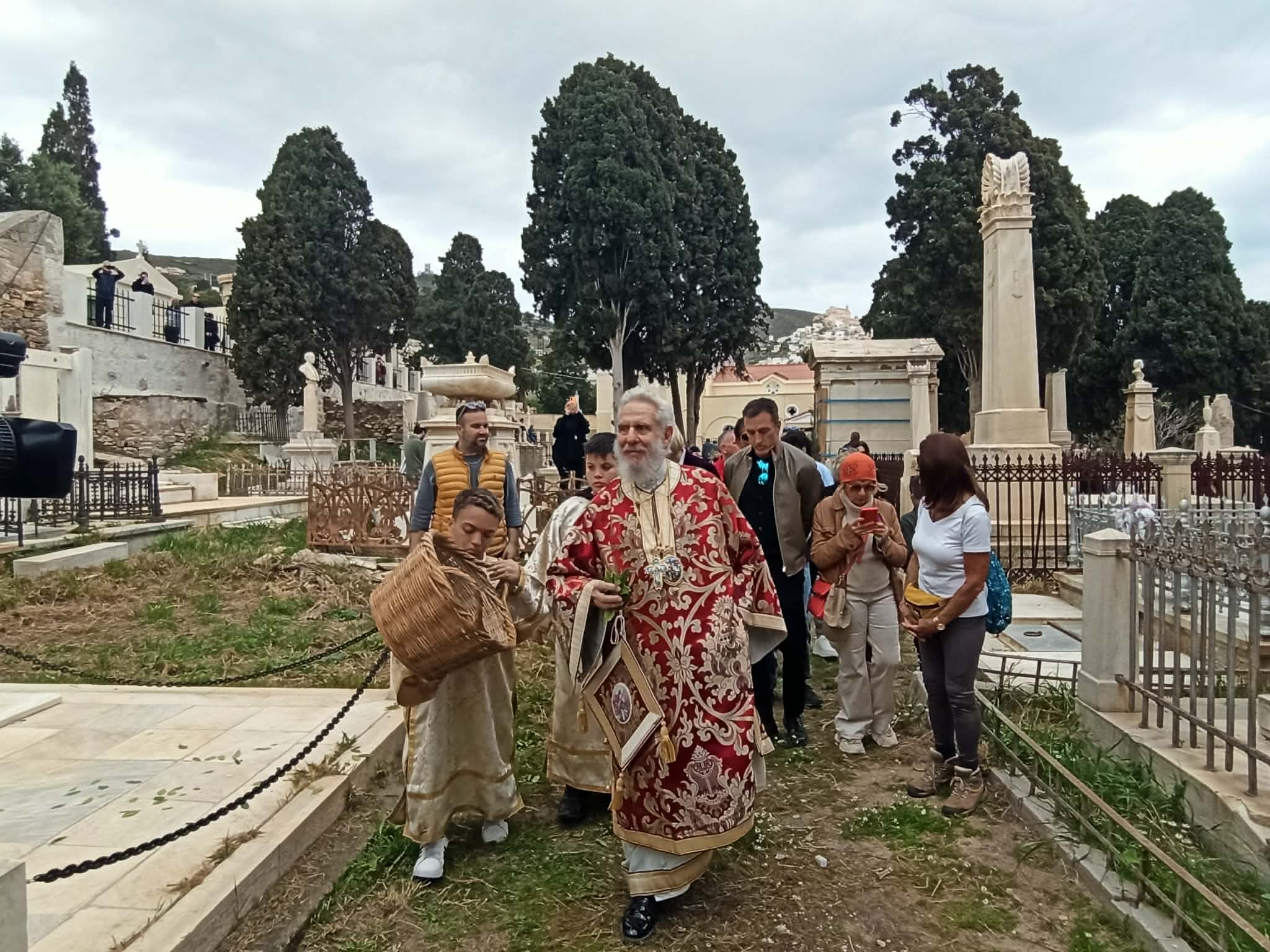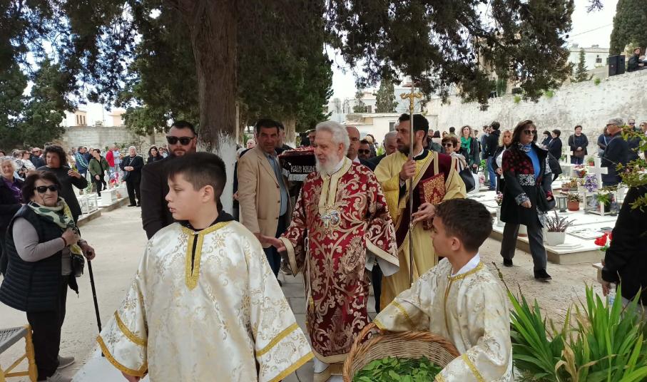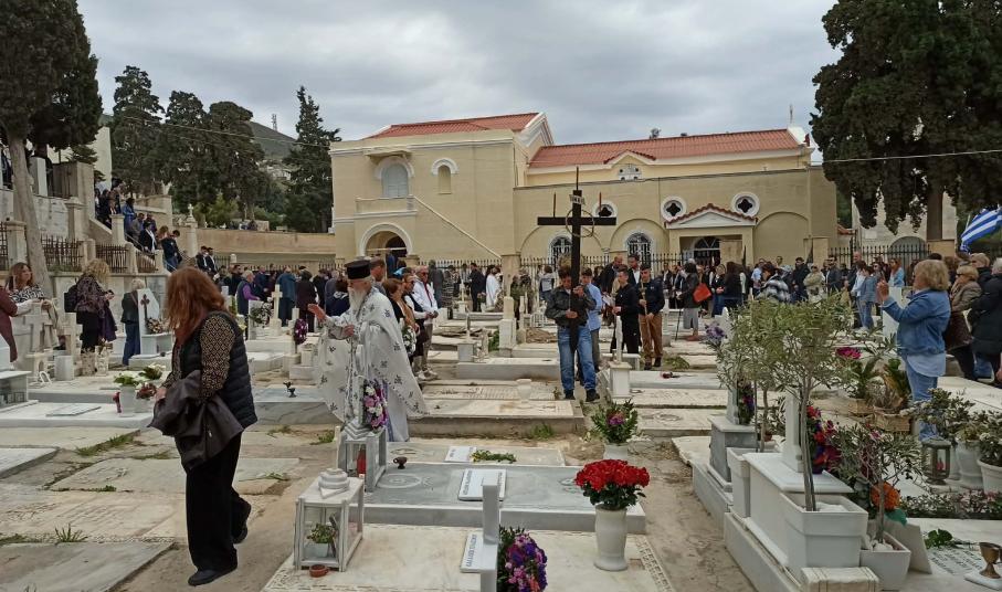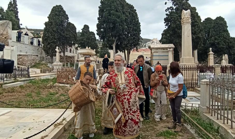 Η Φιλαρμονική μπάντα του Δήμου Σύρου - Ερμούπολης παιάνιζε πένθιμα εμβατήρια, ενώ δεκάδες άνθρωποι συνέρρεαν από το πρωί στο κοιμητήριο του Αγίου Γεωργίου στην Ερμούπολη, κρατώντας λουλούδια στα χέρια για να τιμήσουν τη μνήμη των αγαπημένων τους προσώπων και να παρακολουθήσουν αυτήν την ιδιαίτερα συγκινητική και φορτισμένη συναισθηματικά θρησκευτική εκδήλωση.