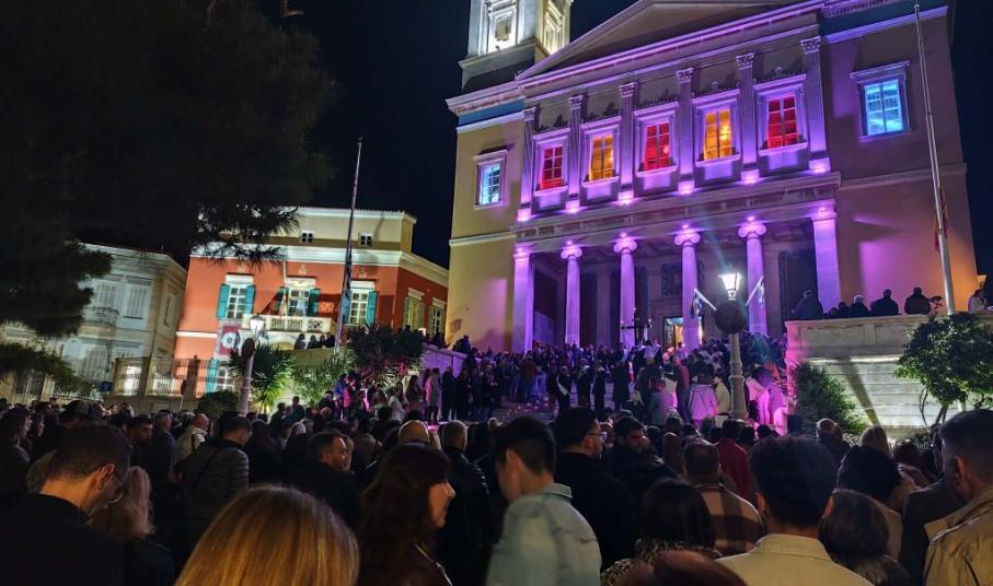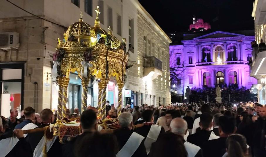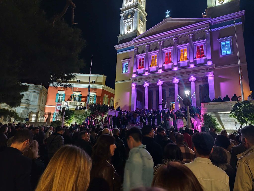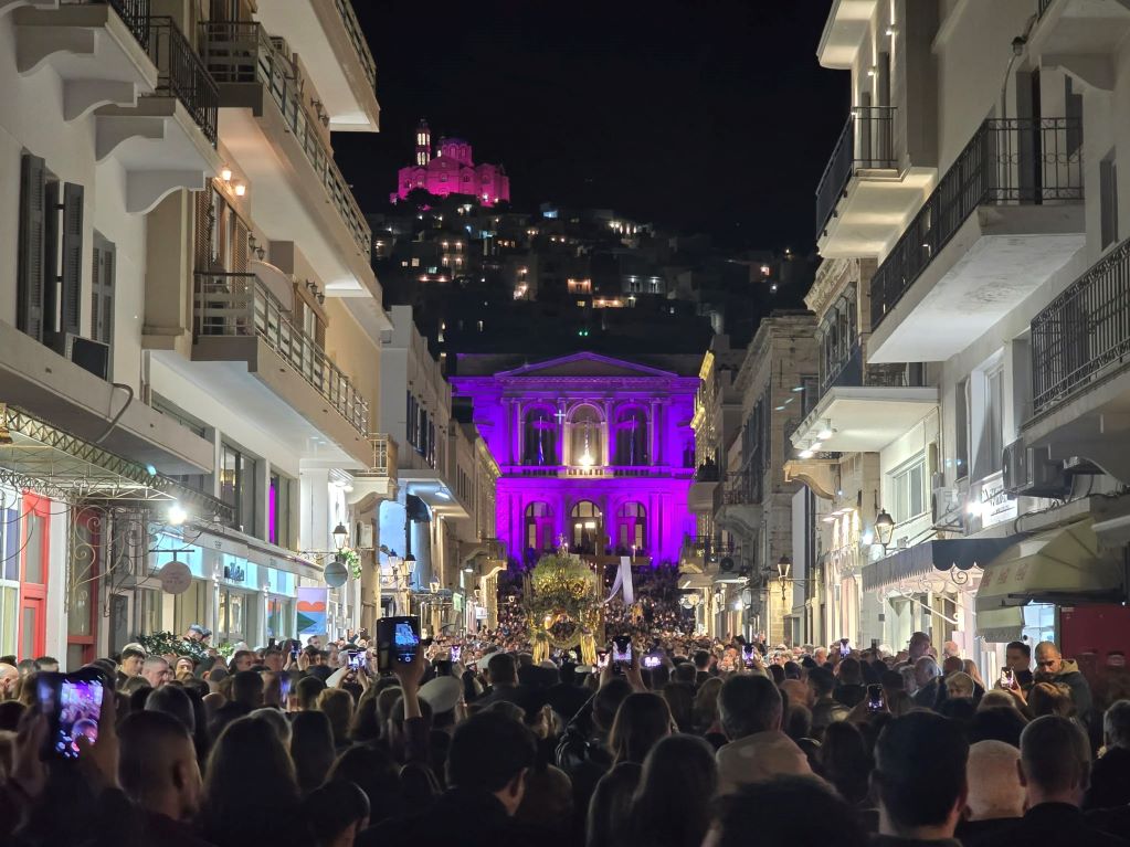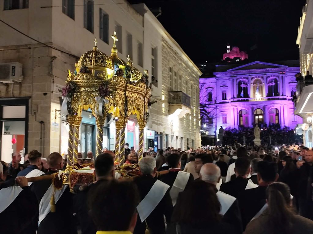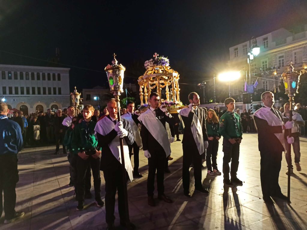 Με θρησκευτική ευλάβεια, κατάνυξη και υπό των ήχων των πένθιμων εμβατηρίων της Φιλαρμονικής του Δήμου Σύρου – Ερμούπολης, πραγματοποιήθηκε η λιτάνευση των τριών επιταφίων στο κέντρο της Ερμούπολης.