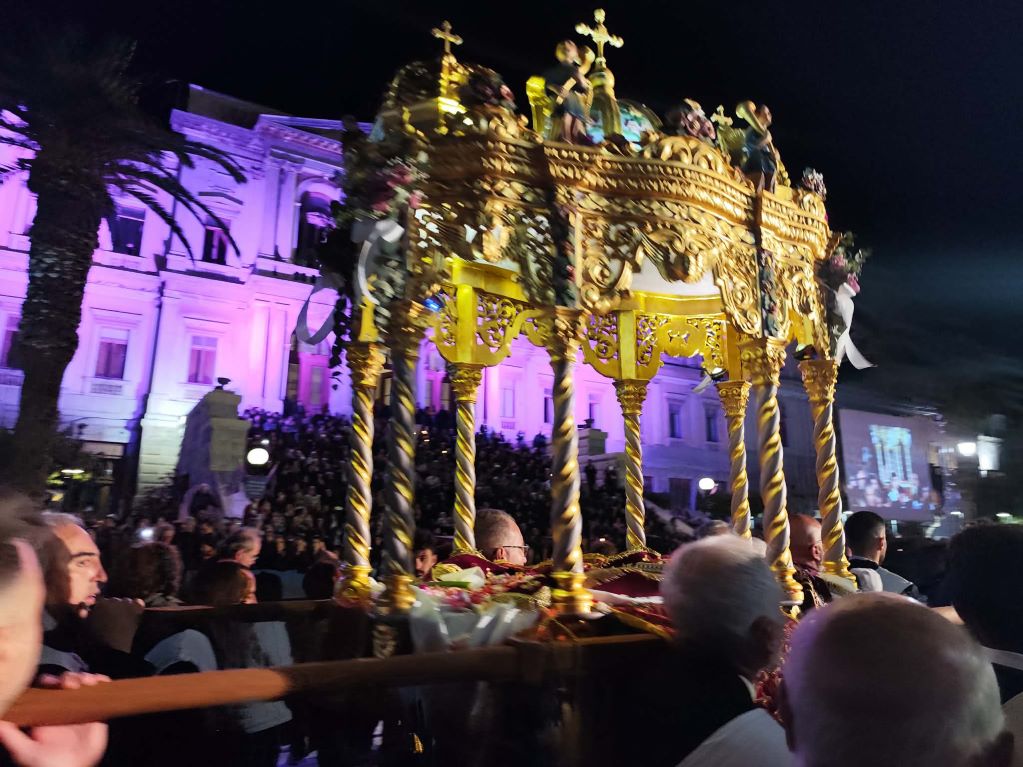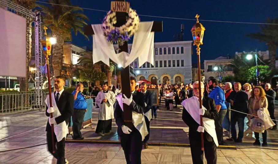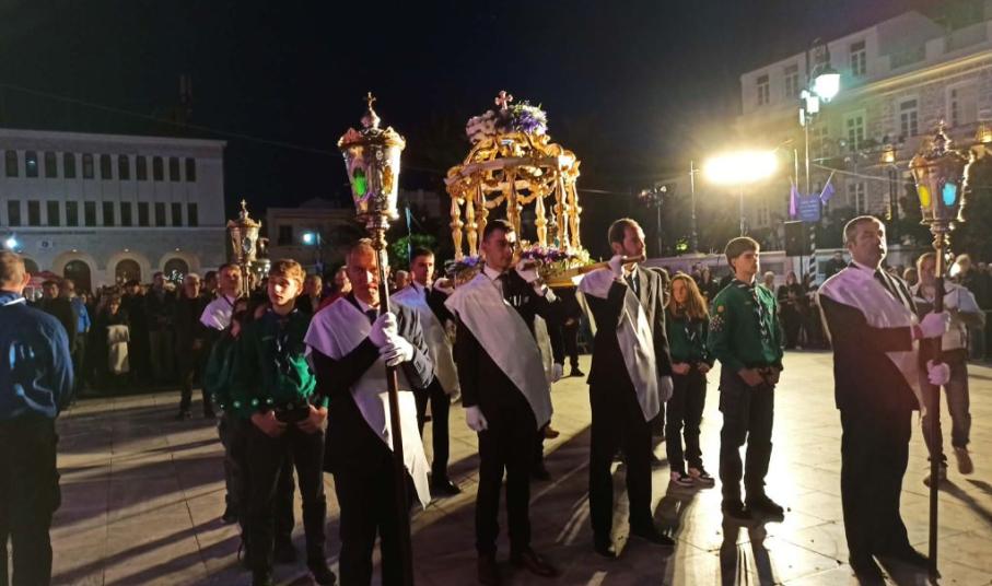 Της συνάντησης των τριών Ορθόδοξων Επιταφίων, προηγήθηκε η περιφορά του Επιταφίου του Ι. Ν. Ευαγγελιστρίας των Καθολικών στην Ερμούπολη.