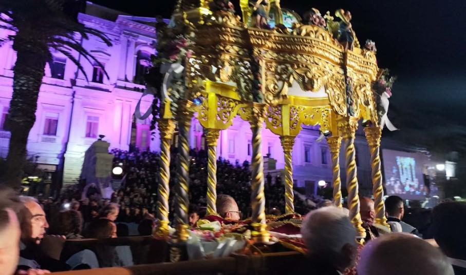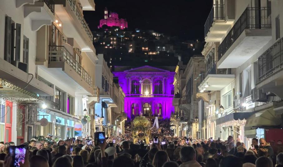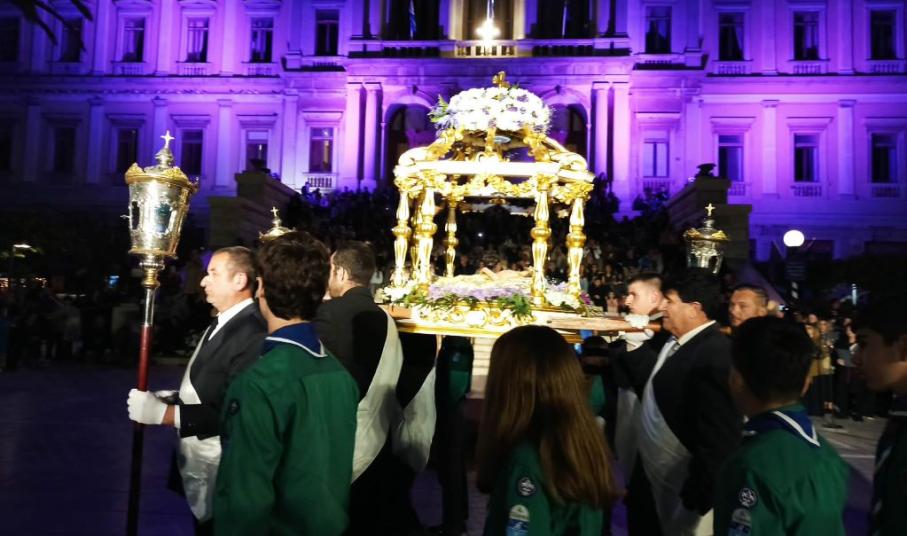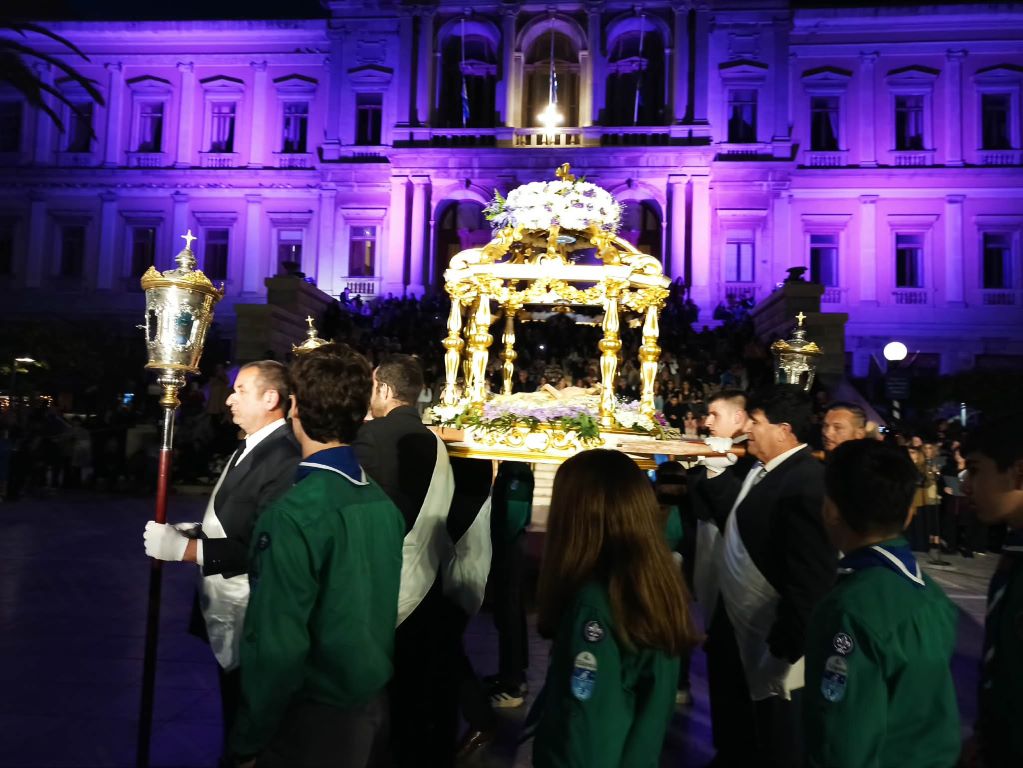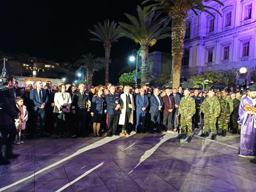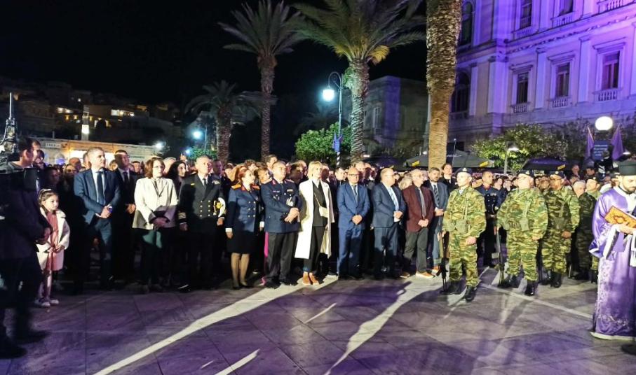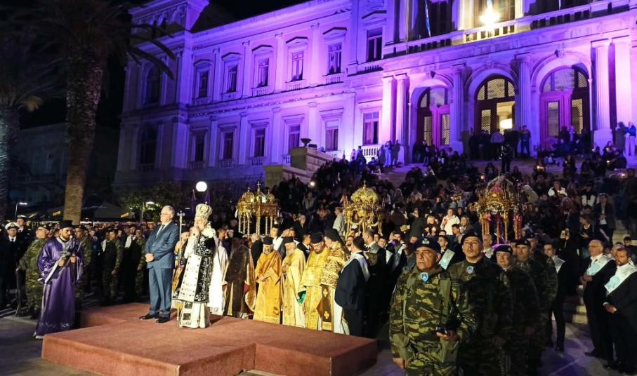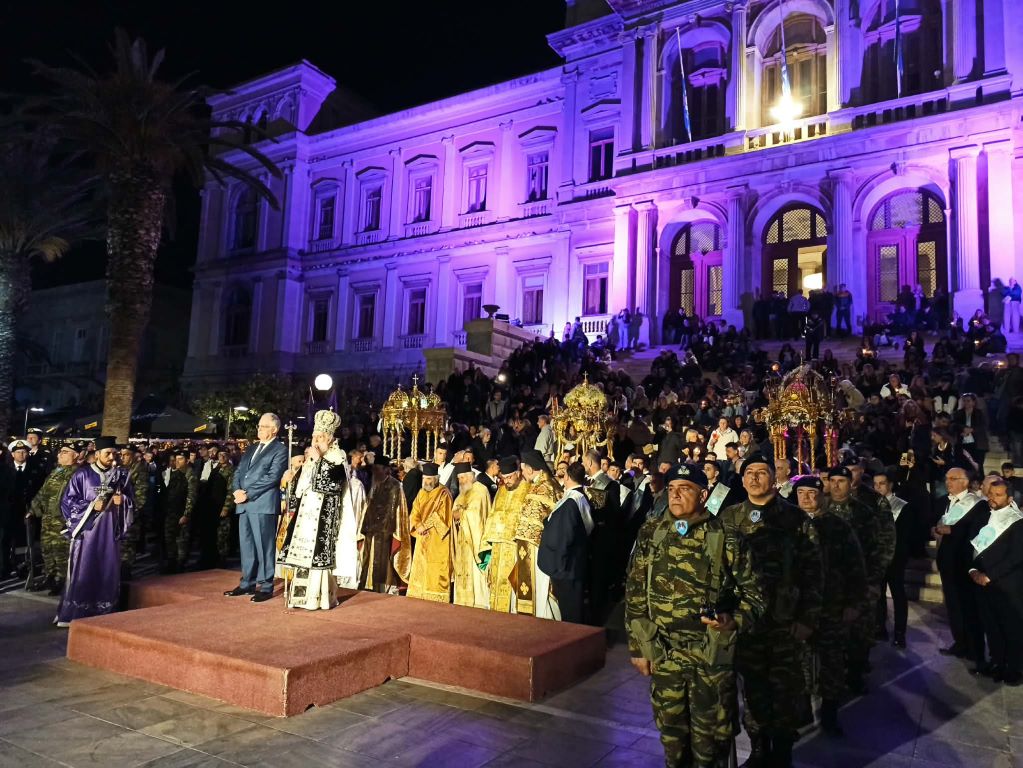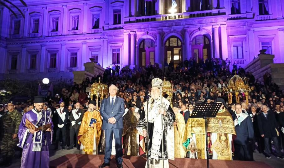 Η περιφορά των επιταφίων, διασχίζοντας τους δρόμους και τα στενά του ιστορικού κέντρου, κατέληξαν στην πλατεία Μιαούλη, όπου ο Σεβασμιώτατος Μητροπολίτης Σύρου κ. Δωρόθεος Β΄ μετά από την ολοκλήρωση της ιερής δέησης, εκφώνησε ομιλία παρουσία εκπροσώπων της πολιτείας, της αυτοδιοίκησης α΄ και β΄ βαθμού, των Σωμάτων Ασφαλείας και πιστών.