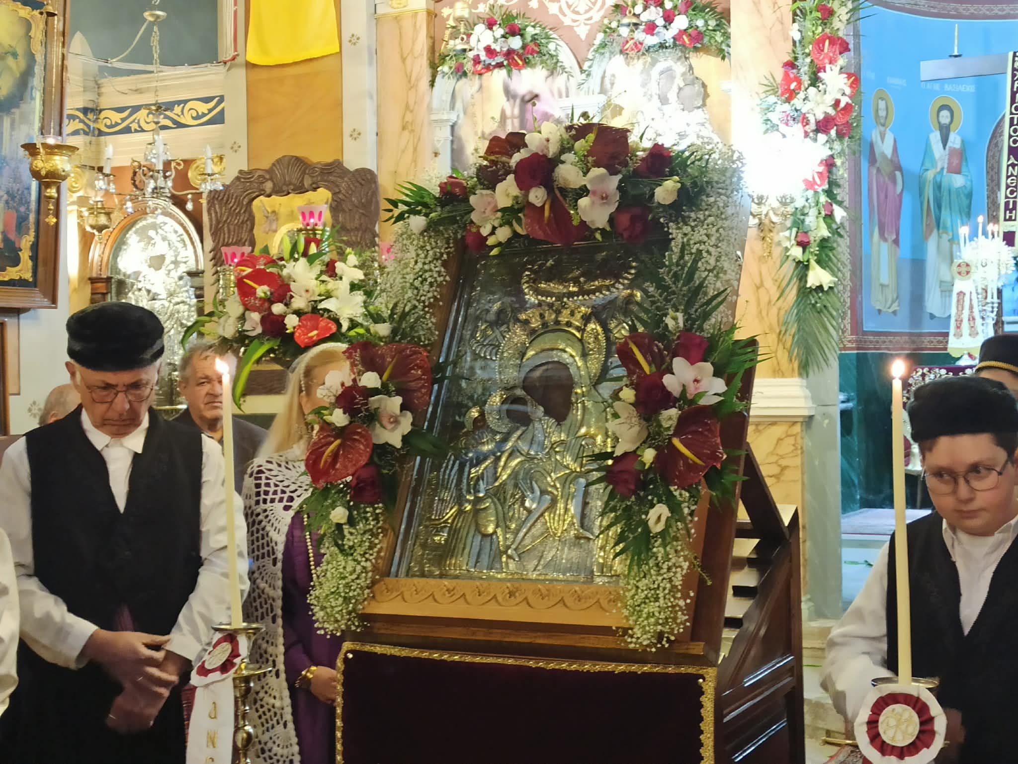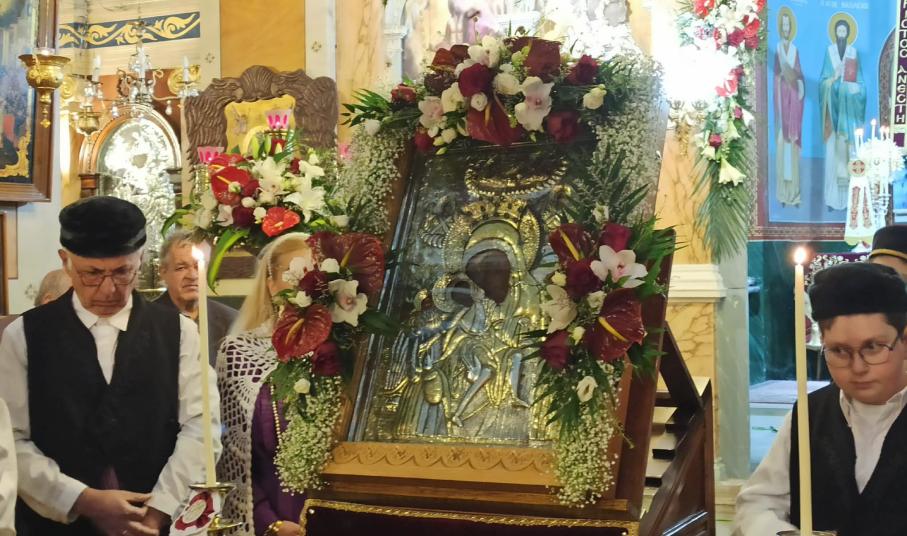 Την εικόνα, η οποία έφθασε στον αύλειο χώρο του ναού λίγα λεπτά μετά τις 7 και μισή το απόγευμα, συνοδευόμενη από τον αρχιμ. Ραφαήλ Κατακεχαγιά, κομισαμένου εκ’ του ναού Κοιμήσεως της Θεοτόκου, Ταύρου Αθηνών, υποδέχθηκαν τόσο ο μητροπολίτης Σύρου, Δωρόθεος Β’, όσο και τα μέλη του Συλλόγου Μικρασιατών Σύρου, την οποία και μετέφεραν στο εσωτερικό της.
