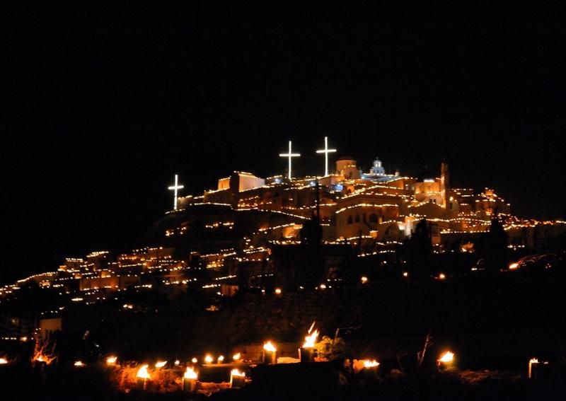 Στη Σαντορίνη, η περιφορά του Επιταφίου στον Πύργο θα γίνει ανάμεσα σε 7.000 μικρές φωτιές σε λυχναράκια, συνθέτοντας ένα φαντασμαγορικό σκηνικό, που θα ενέπνεε και τον πιο ευφάνταστο σκηνοθέτη. Την Κυριακή του Πάσχα θα γίνει το λαϊκό δικαστήριο του “Οβραίου”, ο οποίος καταδικάζεται σε θάνατο, κρεμιέται και καίγεται από τους κατοίκους με αυτοσχέδια δυναμιτάκια και βαρελότα.