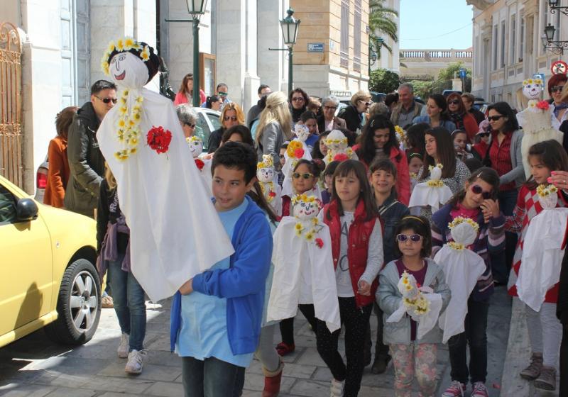 Όπως κάθε χρόνο, έτσι και φέτος, τα παιδιά του Λυκείου των Ελληνίδων έφτιαξαν τον καθιερωμένο Λάζαρο με κουτάλα ή τρυπητή και συνοδευόμενα από τις δασκάλες τους προσέφεραν ένα μοναδικό θέαμα σε όσους βρίσκονταν το μεσημέρι του Σαββάτου στο κέντρο της Ερμούπολης.