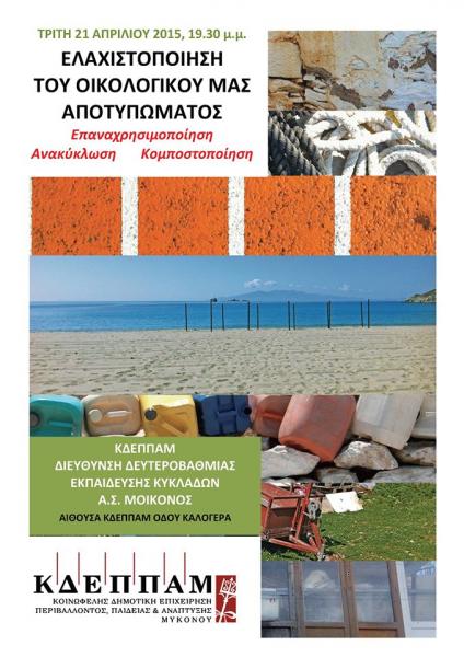 Τριήμερο εκδηλώσεων εκπαίδευσης, ενημέρωσης και ευαισθητοποίησης για τις πολλαπλές αξίες της Επαναχρησιμοποίησης, Ανακύκλωσης και Κομποστοποίησης διοργανώνουν στη Μύκονο η Κοινωφελής Δημοτική Επιχείρηση του Δήμου Μυκόνου, η Διεύθυνση Δευτεροβάθμιας Εκπαίδευσης Κυκλάδων και η WWF Ελλάς.