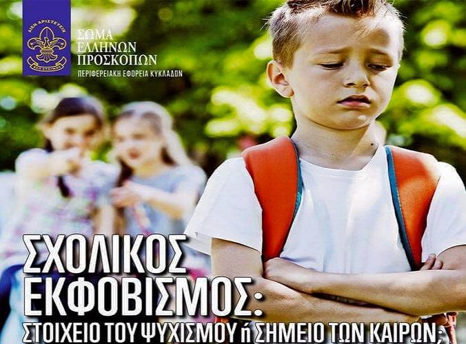 Η Περιφερειακή Εφορεία Προσκόπων Κυκλάδων, διοργανώνει ένα διήμερο συναντήσεων με παιδιά, εφήβους και γονείς στις 30 και 31/5/2015, με αντικείμενο ένα θέμα που απασχολεί ιδιαίτερα το τελευταίο διάστημα παιδιά και γονείς, την αντιμετώπιση του σχολικού εκφοβισμού (Bullying).