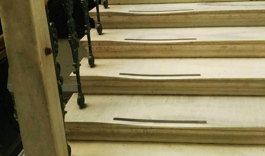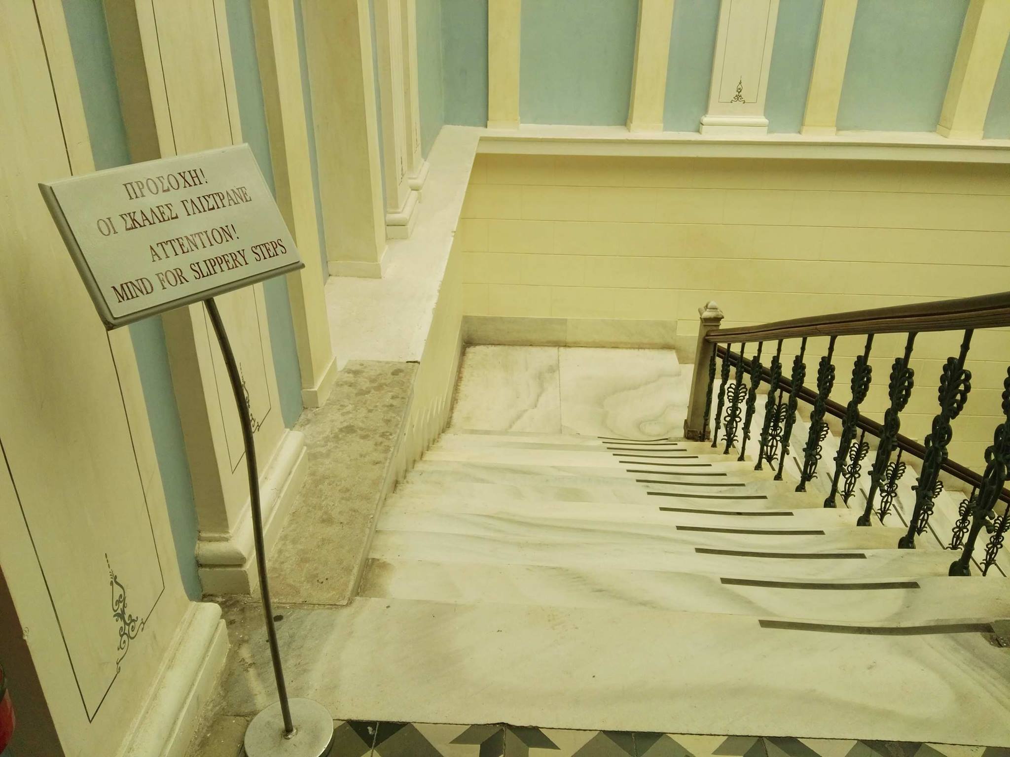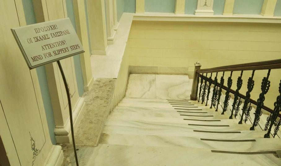 Πρέπει να σημειωθεί πως, η εν λόγω κλίμακα που χαρακτηρίζεται για την ιδιαίτερη τεχνοτροπία της και είναι σχεδόν μοναδική σε κτίρια της χώρας που δεν έχει βάση, δεν “τραυματίζεται” αισθητικά από την τοποθέτηση των αντιολισθητικών ταινιών, γεγονός πολύ σημαντικό.