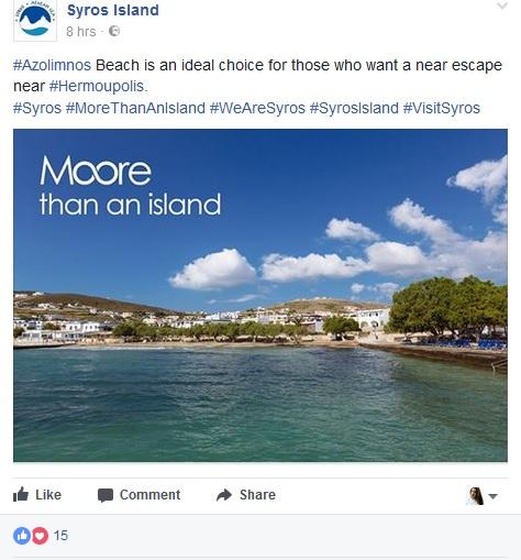 Χαρακτηριστικές φωτογραφίες της Σύρου από διάφορες περιοχές, γλυκίσματα, τοπικά προϊόντα και εδέσματα, καθώς επίσης, ενημέρωση περί των πολιτιστικών εκδηλώσεων της τρέχουσας περιόδου του προγράμματος “Σύρος Πολιτισμός 2017”, συνθέτουν το περιεχόμενο των εν λόγω διαδικτυακών αναρτήσεων, οι οποίες ωστόσο παραμένουν περιορισμένες σε αριθμό καθημερινά, με τη συγκεκριμένη σελίδα που πλέον περιλαμβάνει και το νέο σλόγκαν “Μore than an island” και μάλιστα αξιοποιώντας το σύμβολο που δηλώνει το άπειρο στην πρώτη λέξη, να φαίνεται ότι δεν έχει την προσδοκώμενη δυναμική.