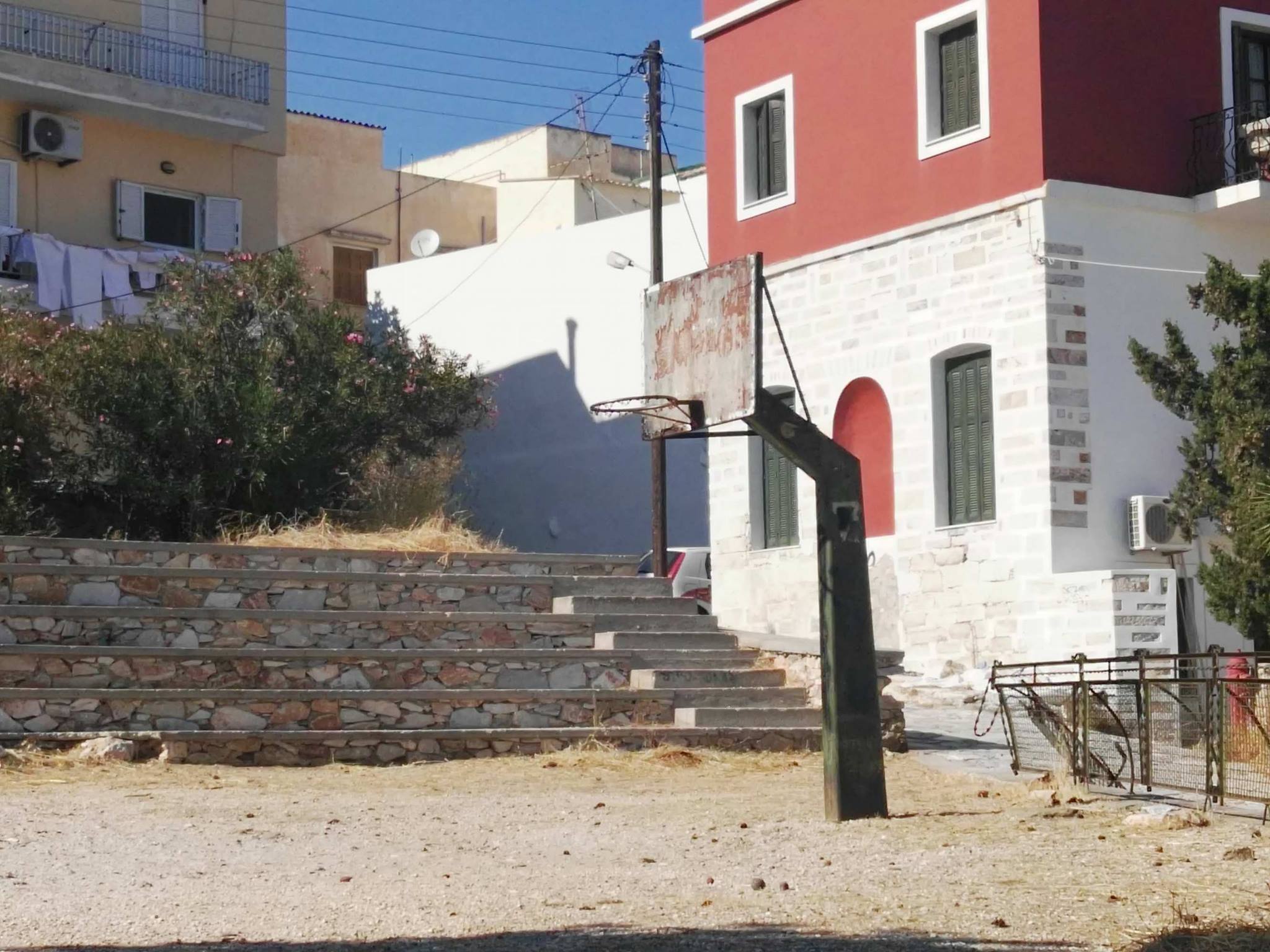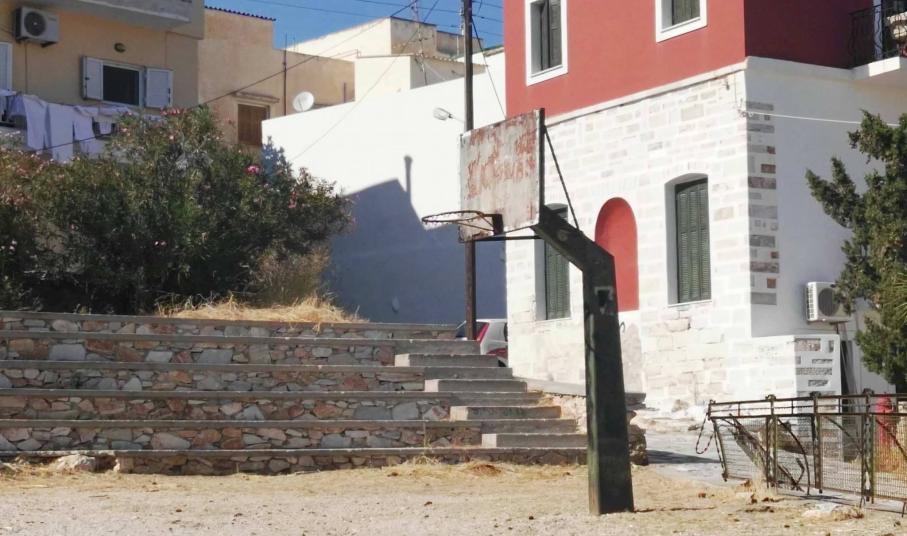 Σε παρόμοια κατάσταση βρίσκεται δε και ο χώρος που γειτνιάζει και φιλοξενεί δύο μπασκέτες, που μόνον στοιχειωδώς μπορεί να θεωρήσει κάποιος, ότι παραπέμπει σε μικρό γήπεδο καλαθοσφαίρισης.