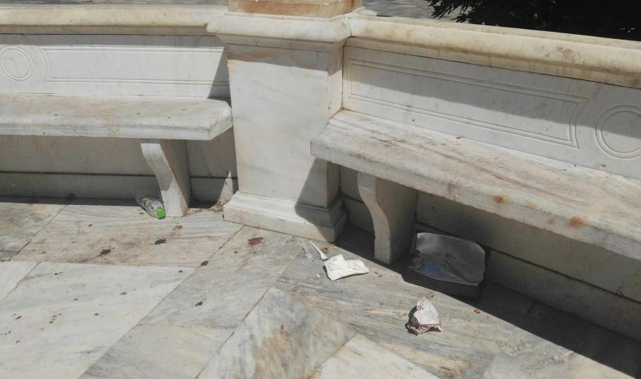 Αναμενόμενη φθορά μα και καταστροφικού χαρακτήρα πράξεις θίγουν την εικόνα της ιστορικής (Παγκαλείου) εξέδρας στην πλατεία Μιαούλη, η οποία και αποτελεί ένα σημαντικό μνημείο για τη Σύρο, που ολοκληρώνει το σπουδαίο αρχιτεκτονικό κάλλος που “δεσπόζει” στο ιστορικό κέντρο της Ερμούπολης.