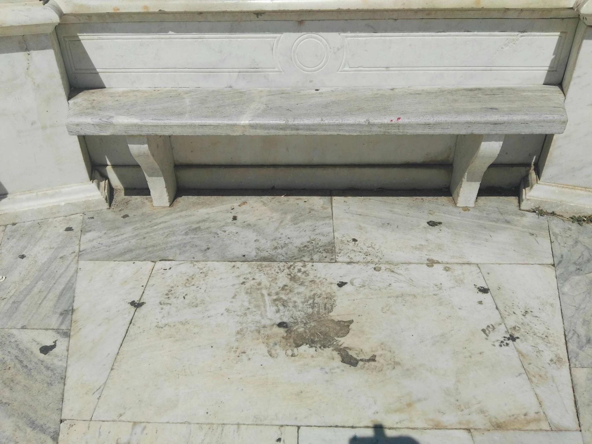 Συγκεκριμένα, στίγματα από αναψυκτικά και κάθε είδους αλκοολούχα ποτά διαπιστώνονται στον εσωτερικό χώρο της εξέδρας και στο δάπεδό της, ενώ περιμετρικά στο μαρμάρινο τοιχίο της, παρατηρούνται συνθήματα και γραμμένες λέξεις με ανεξίτηλα χρώματα και μαρκαδόρους.