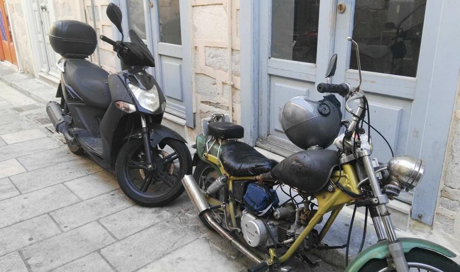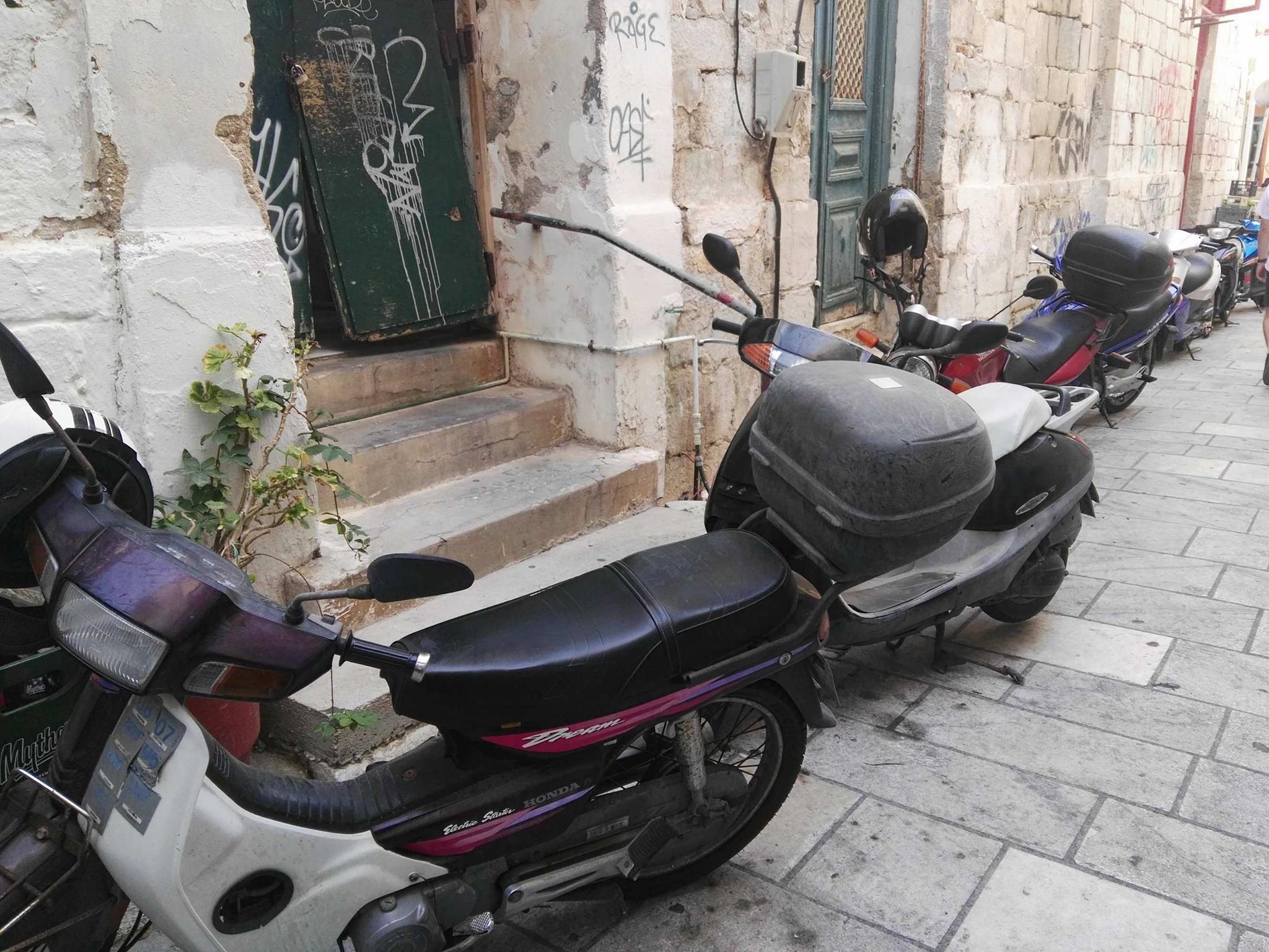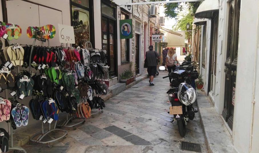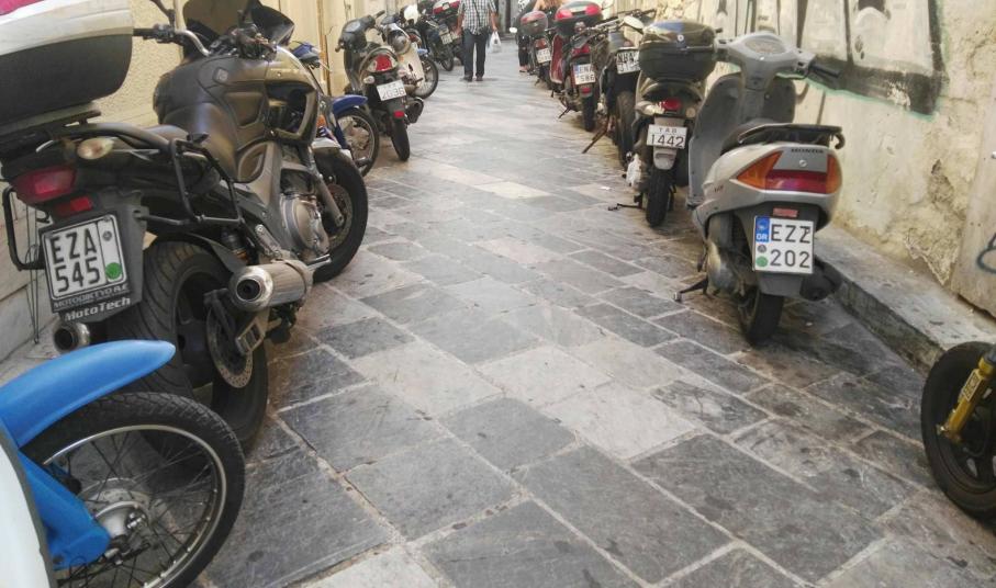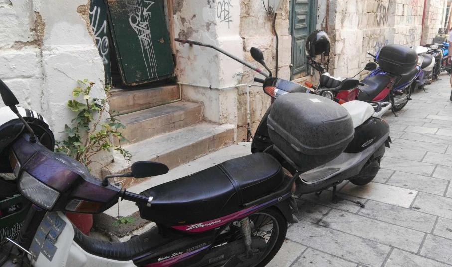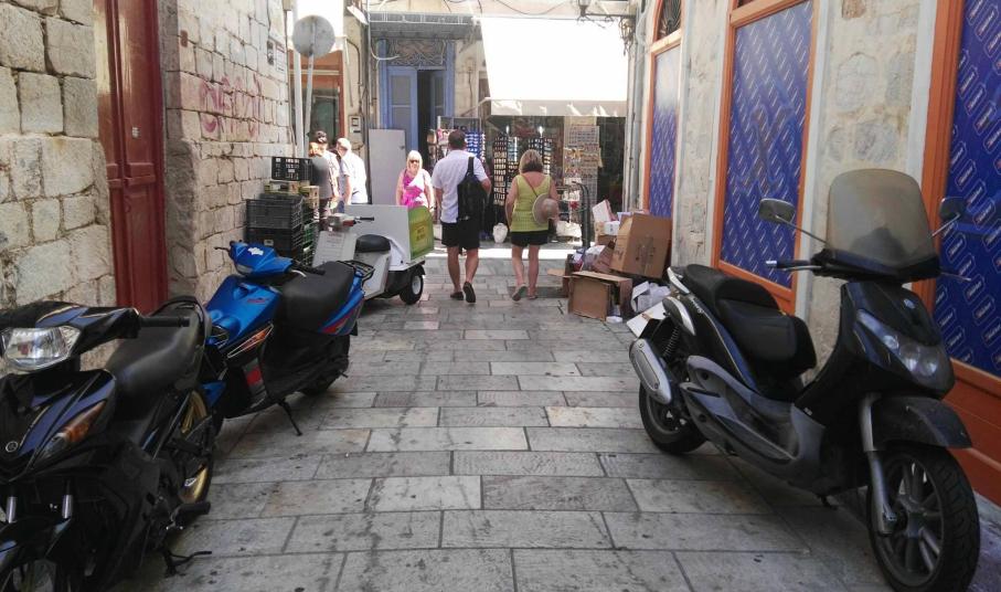 Ασφυκτικά γεμάτες από δίκυκλα παραμένουν ορισμένες οδοί της Ερμούπολης που είναι πεζοδρομημένες, με τους οδηγούς να εξακολουθούν μετά το πέρας της καλοκαιρινής περιόδου να “πνίγουν” την παραδοσιακή ομορφιά των μικρών δρόμων στους λιγοστούς επισκέπτες που υπάρχουν την παρούσα περίοδο στη Σύρο.
