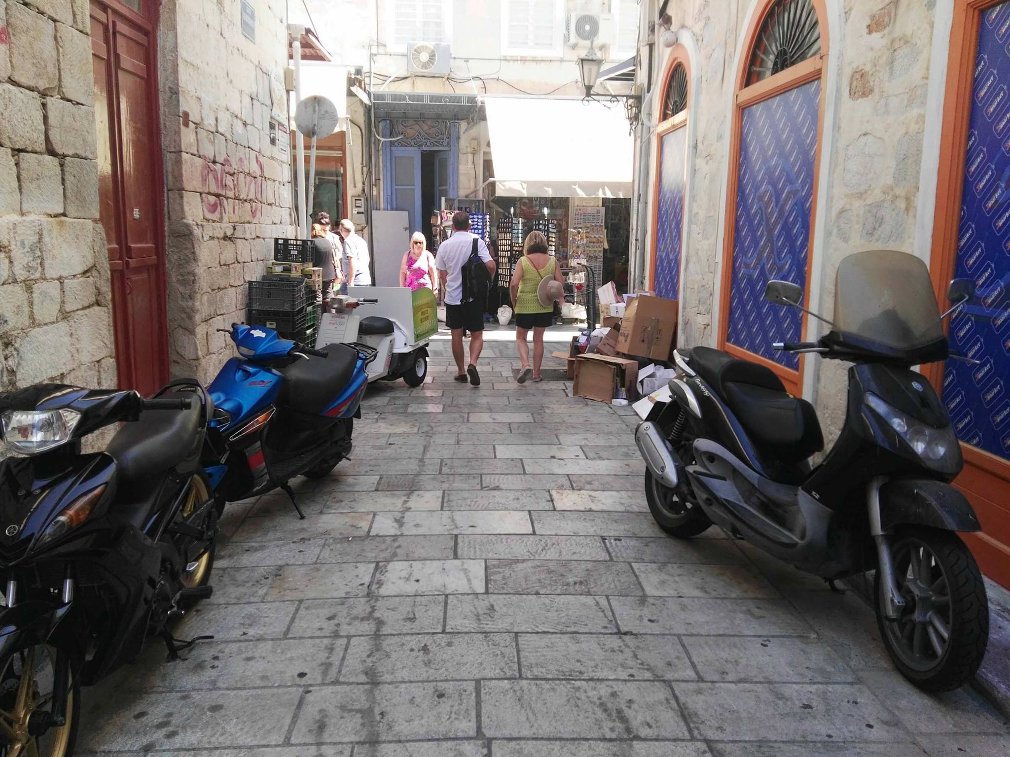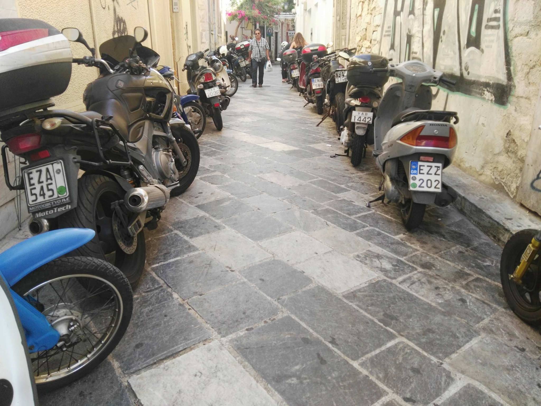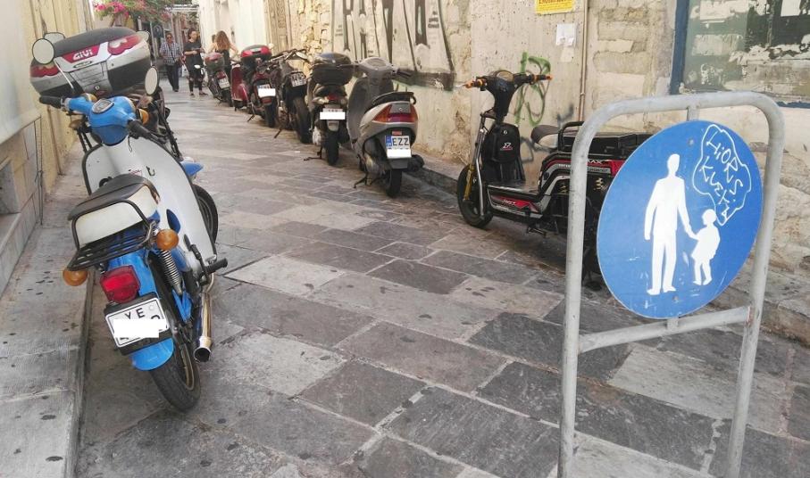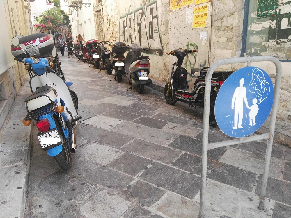 Ασφυκτικά γεμάτες από δίκυκλα παραμένουν ορισμένες οδοί της Ερμούπολης που είναι πεζοδρομημένες, με τους οδηγούς να εξακολουθούν μετά το πέρας της καλοκαιρινής περιόδου να “πνίγουν” την παραδοσιακή ομορφιά των μικρών δρόμων στους λιγοστούς επισκέπτες που υπάρχουν την παρούσα περίοδο στη Σύρο.