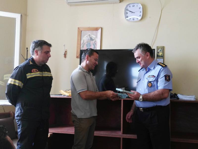 Τον ίδιο αποχαιρέτησαν μεταξύ άλλων, ο Περιφερειακός Διοικητής του Πυροσβεστικού Σώματος, Άγγελος Τριπολιτσιώτης, προσφέροντάς του μάλιστα ως αναμνηστικό δώρο το έμβλημα του Πυροσβεστικού Σώματος. “Θέλω να σε ευχαριστήσω για την όμορφη συνεργασία που είχαμε τους οκτώ μήνες. Να ευχαριστήσω όλους τους συναδέλφους και όλους τους φορείς για τα μηνύματα που παίρνω εντός κι εκτός Υπηρεσίας. Αισθάνομαι την ανάγκη να σου πω καλό ταξίδι και καλή επιστροφή στον χώρο σου, καλή τύχη στην καινούργια σου θέση” σημείωσε ο κ. Τριπολιτσιώτης, στα λόγια του οποίου προστέθηκαν οι λακωνικές αναφορές αναγνώρισης του έργου του από τον εκπρόσωπο του Σωματείου Πυροσβεστών Κυκλάδων.