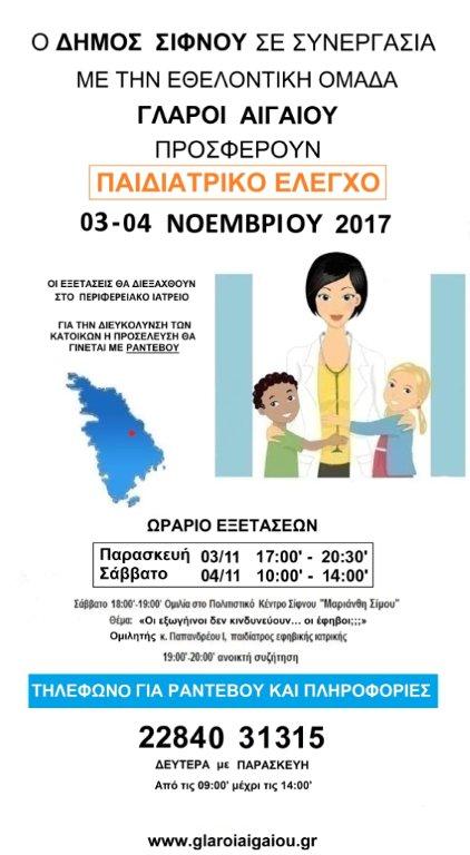 Θα θέλαμε να σας ενημερώσουμε ότι στις 3 και 4 Νοεμβρίου, κλιμάκιο παιδιάτρων (7 Ιατροί) του Κοινωνικού μη Κερδοσκοπικού Συλλόγου «ΓΛΑΡΟΙ ΑΙΓΑΙΟΥ» θα βρίσκεται για ακόμα μία χρονιά στη Σίφνο, για την παροχή πρωτοβάθμιας ιατρικής περίθαλψης σε παιδιά ηλικίας έως 18 ετών και παράλληλα διασυνδετικής με το Τζάνειο Νοσοκομείο.