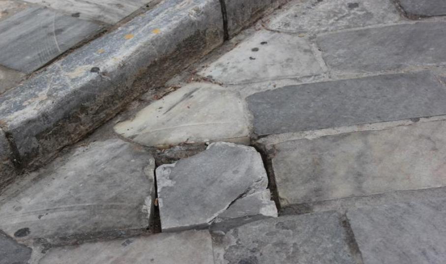 Όπως πολλάκις έχει αναδείξει και η “Κοινή Γνώμη” μέσω της παρούσας σελίδας, σοβαρά προβλήματα αποκόλλησης πλακών και μαρμάρων έχουν καταγραφεί - ενδεικτικά – στον χώρο της πλατείας Σταύρου Βαφία, στον δρόμο πλησίον του Ι.Ν. Μεταμορφώσεως, καθώς επίσης στην προβολή του θεάτρου “Απόλλων”, αλλά και περιμετρικά του κηπάριου του Ι.Ν. του Αγίου Νικολάου, μα και κοντά στην μικρή πλατεία Τσιροπινά.